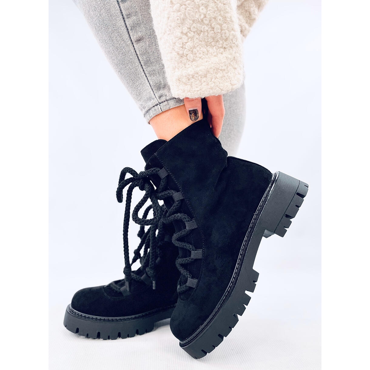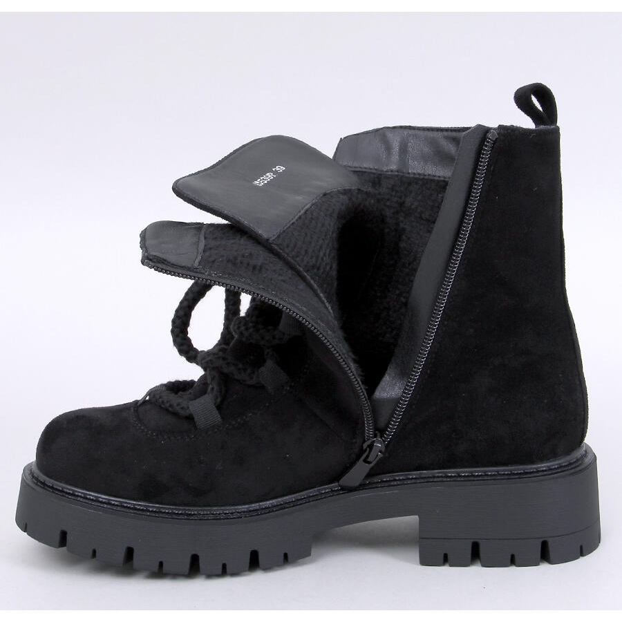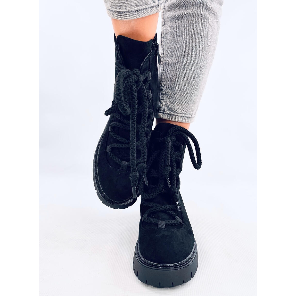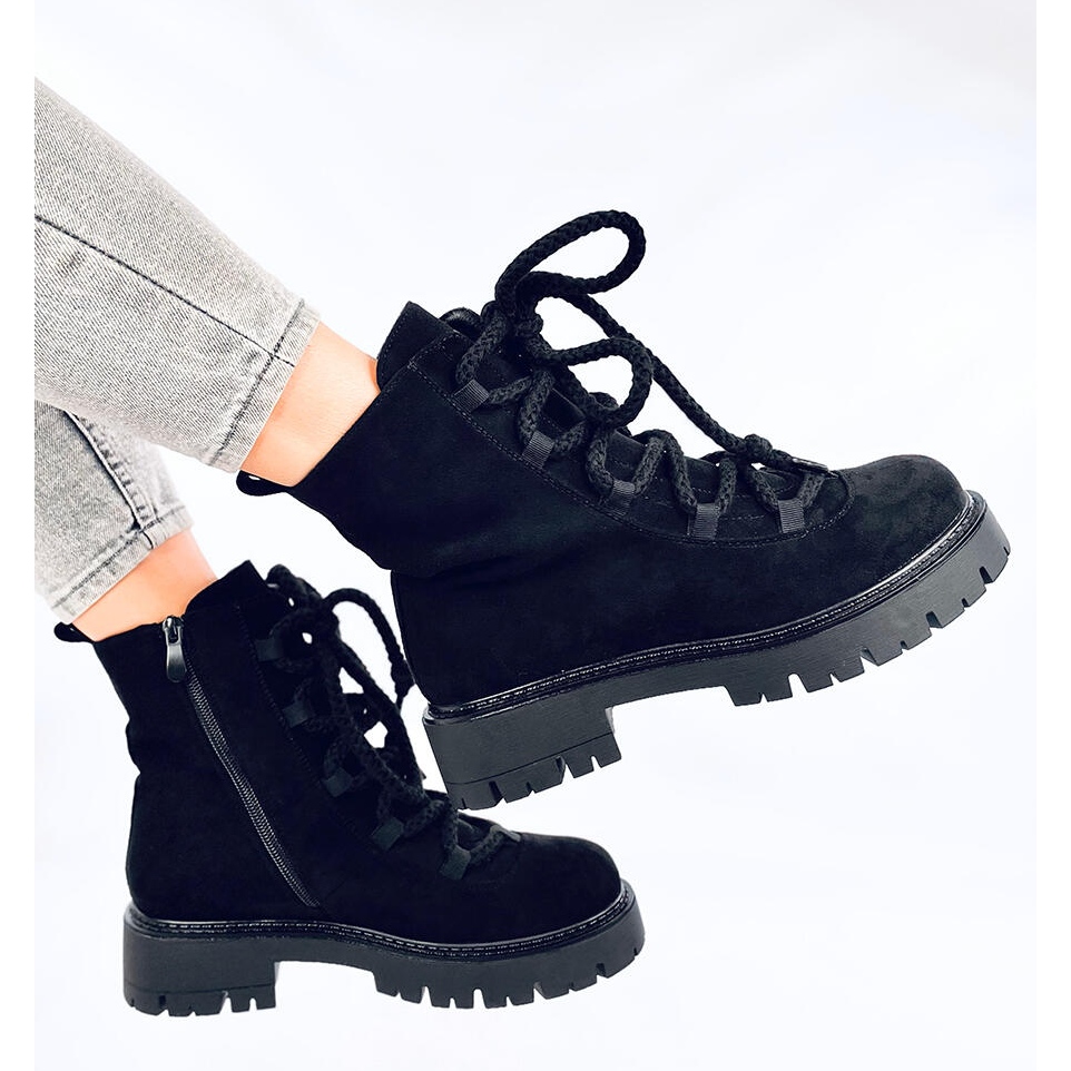 Découvrez le dernier succès de la saison - Bottes lacé avec des lacets noirs épais sans SME dans une couleur noire élégante. Ces travailleurs en daim sur une semelle solide et épaisse s'intègrent parfaitement dans les dernières tendances, attirant l'attention et se réjouissent de leur style d'origine. Conçu pour les femmes modernes qui apprécient non seulement le design à la mode, mais aussi le confort.