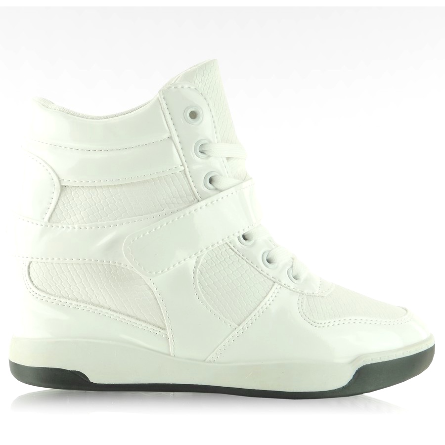 Baskets Move Your foot BKA-84 - modèle blanc, stylé et léger, associant une élégante texture laquée à un subtil motif peau de serpent. Un empiècement blanc contrasté dans la semelle ajoute de la fraîcheur et soulage visuellement la silhouette. Les chaussures sont souples, très légères, et la cale haute de 6 cm donne de la hauteur supplémentaire tout en gardant du confort.