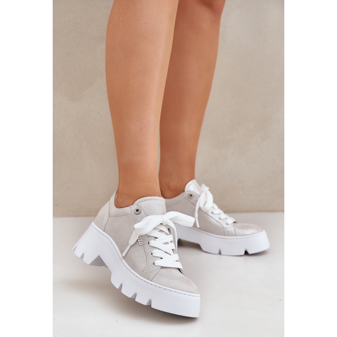 Situé sur une plate-forme de talon de haut et plat de 3,5 cm avec une hauteur de 6 cm, ces baskets offrent de la stabilité, grâce à laquelle ils sont parfaits pour les promenades quotidiennes et dans un style de vie actif. Le nez rond leur donne des subtilités, et la couleur argentée universelle s'intègre effectivement aux dernières tendances de la mode, vous permettant de se combiner facilement avec diverses stylisations - du décontracté à plus élégant.