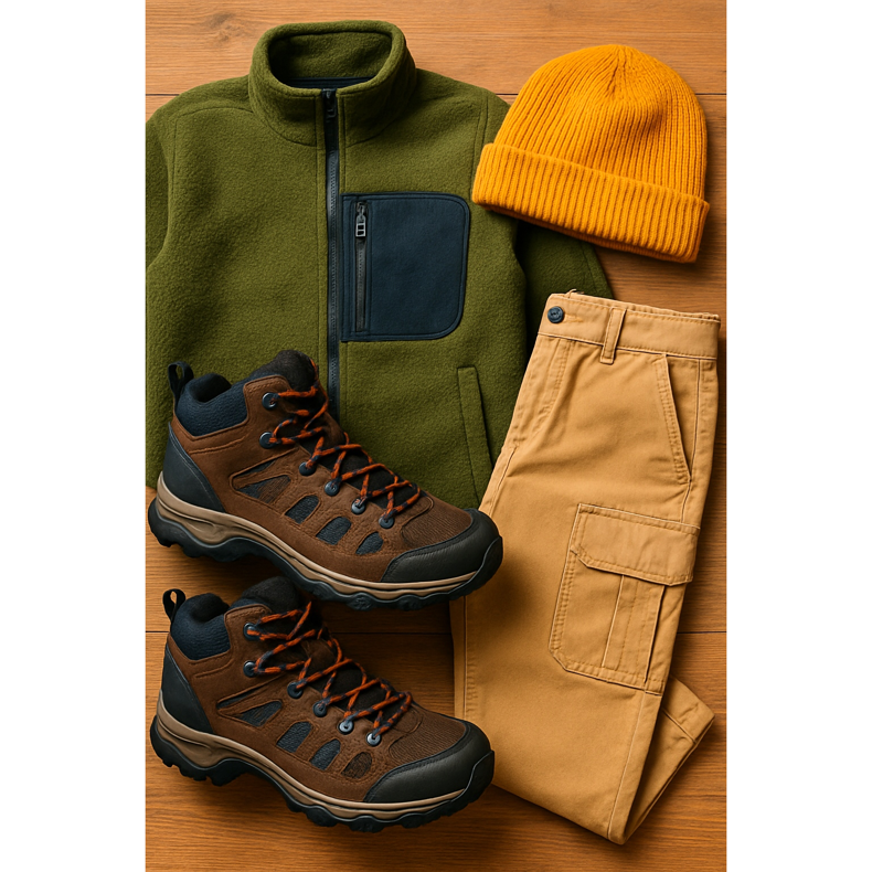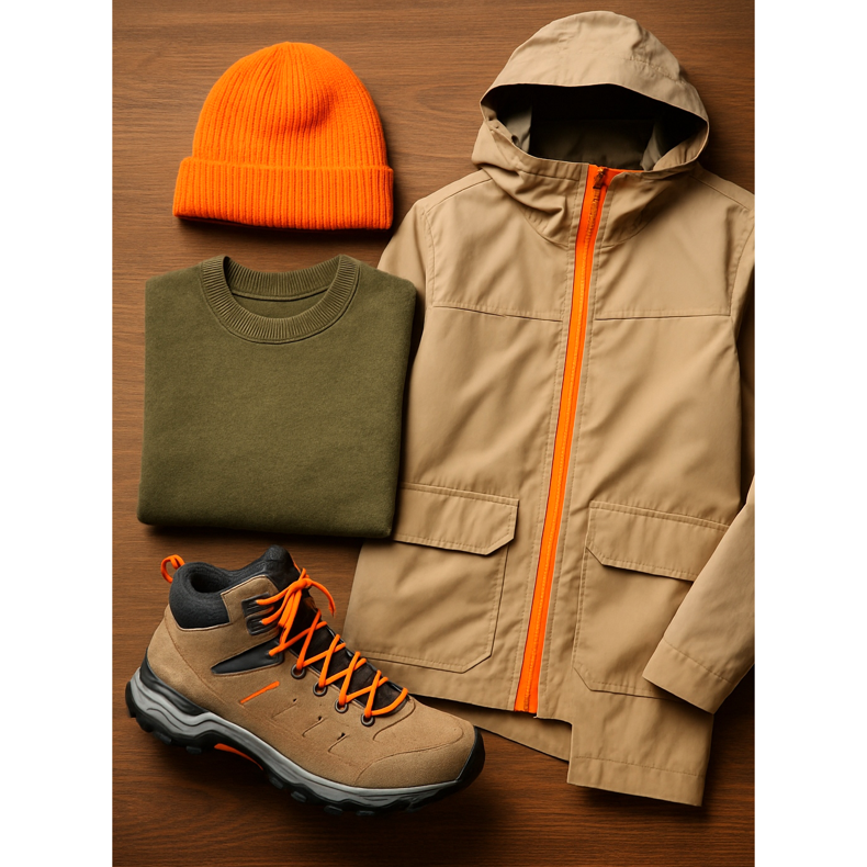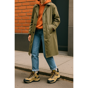 La clé d’un style réussi est le contraste des couleurs. Les chaussures de randonnée ont souvent des inserts fluo vibrants. Profitez-en ! Si vous avez des chaussures à lacets orange, associez-les à un bonnet de la même couleur ou à un imperméable avec un accent similaire. Gardez le reste de la tenue dans des couleurs terreuses sobres – beiges, verts et marrons, qui sont l’essence du style Gorpcore.