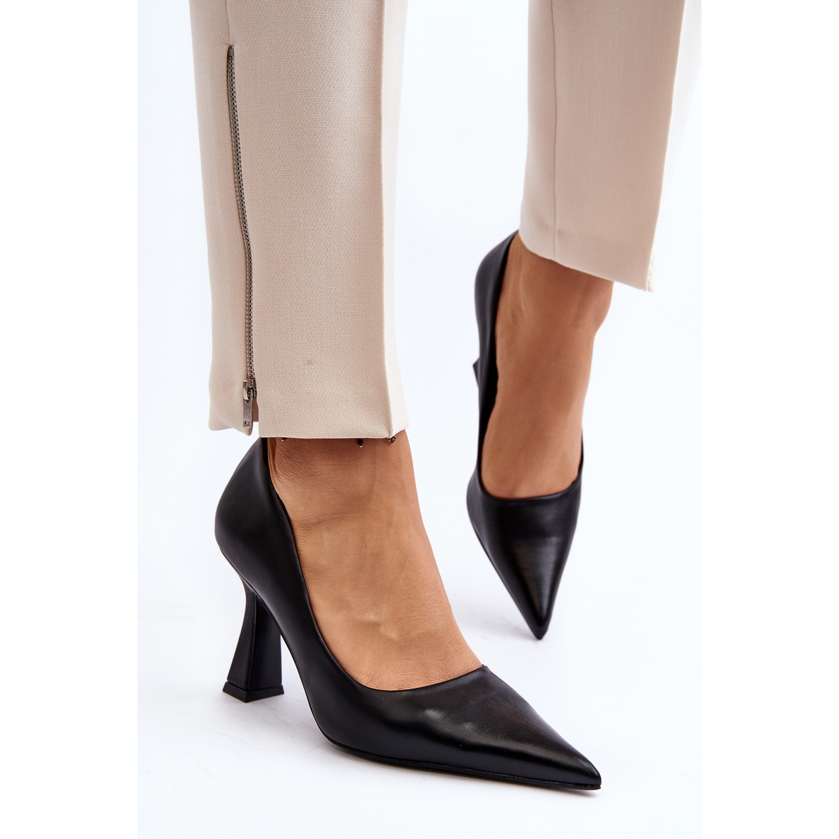 Les talons hauts classiques noirs à bout pointu Delimena sont une pièce essentielle de la garde-robe de chaque femme, qui complétera parfaitement n'importe quel style. Ces chaussures élégantes sont fabriquées en cuir écologique de haute qualité, ce qui les rend extrêmement élégantes et en même temps respectueuses de l'environnement. Leur nez pointu expressif affine optiquement les jambes, ajoutant élégance et classe.