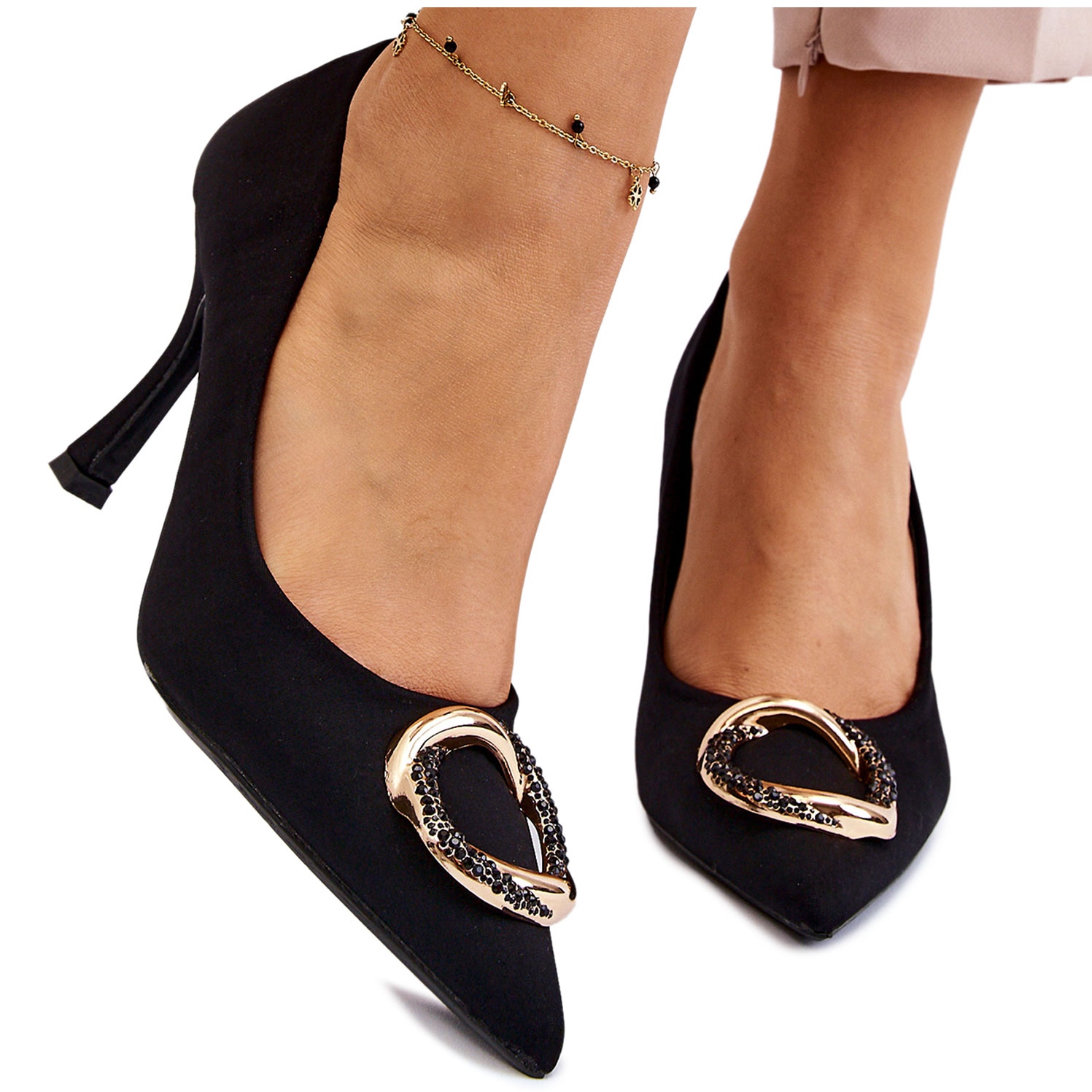 Une attention particulière est portée à la décoration constituée d'un cercle entrelacé, orné de strass, qui ajoute un caractère unique aux chaussures. Le bout pointu et le talon aiguille fin affinent optiquement les jambes, rendant chaque style plus élégant.
