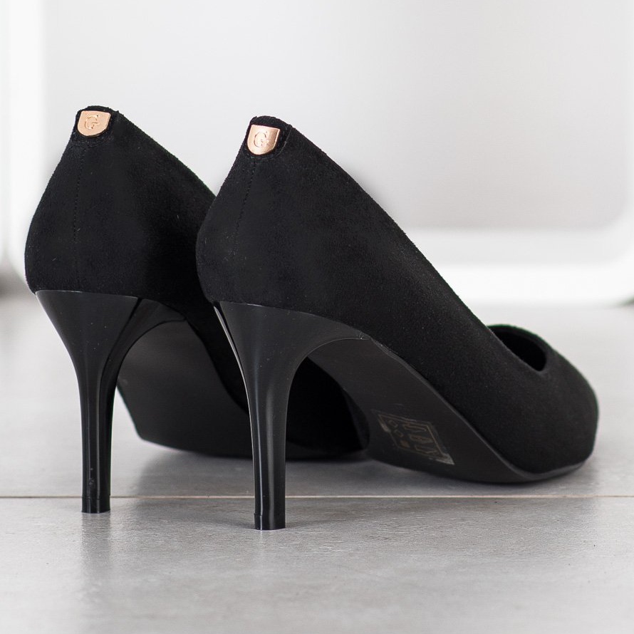 Fabriqués en cuir suédé écologique, ils sont exceptionnellement chics et sont également respectueux de l'environnement. Les talons hauts noirs se distinguent par un bout fin et pointu, qui ajoute sophistication et subtilité. Le matériau intérieur utilisé est composé à 50 % de cuir naturel, ce qui assure un confort de port et une ventilation adéquate des pieds.
