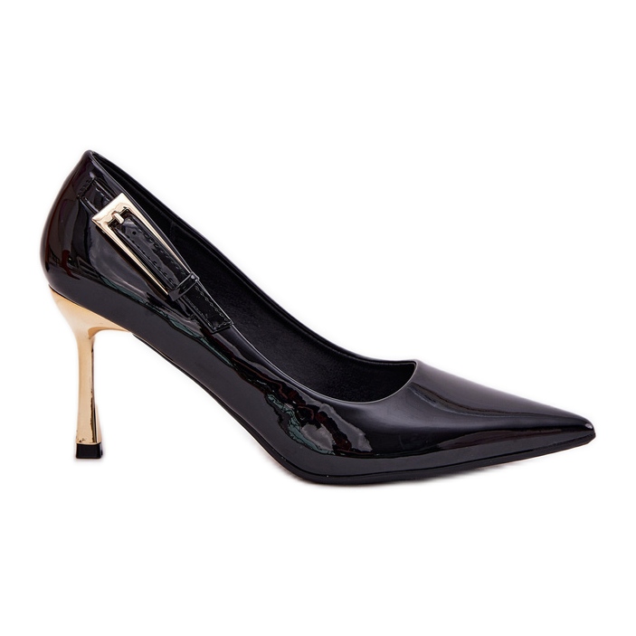 Découvrez l'élégance et le style moderne grâce à nos talons vernis avec une pince dorée en noir. Ces chaussures de femmes uniques, faites en cuir écologique de haute qualité, combinent le confort et un design sophistiqué qui attire l'attention.