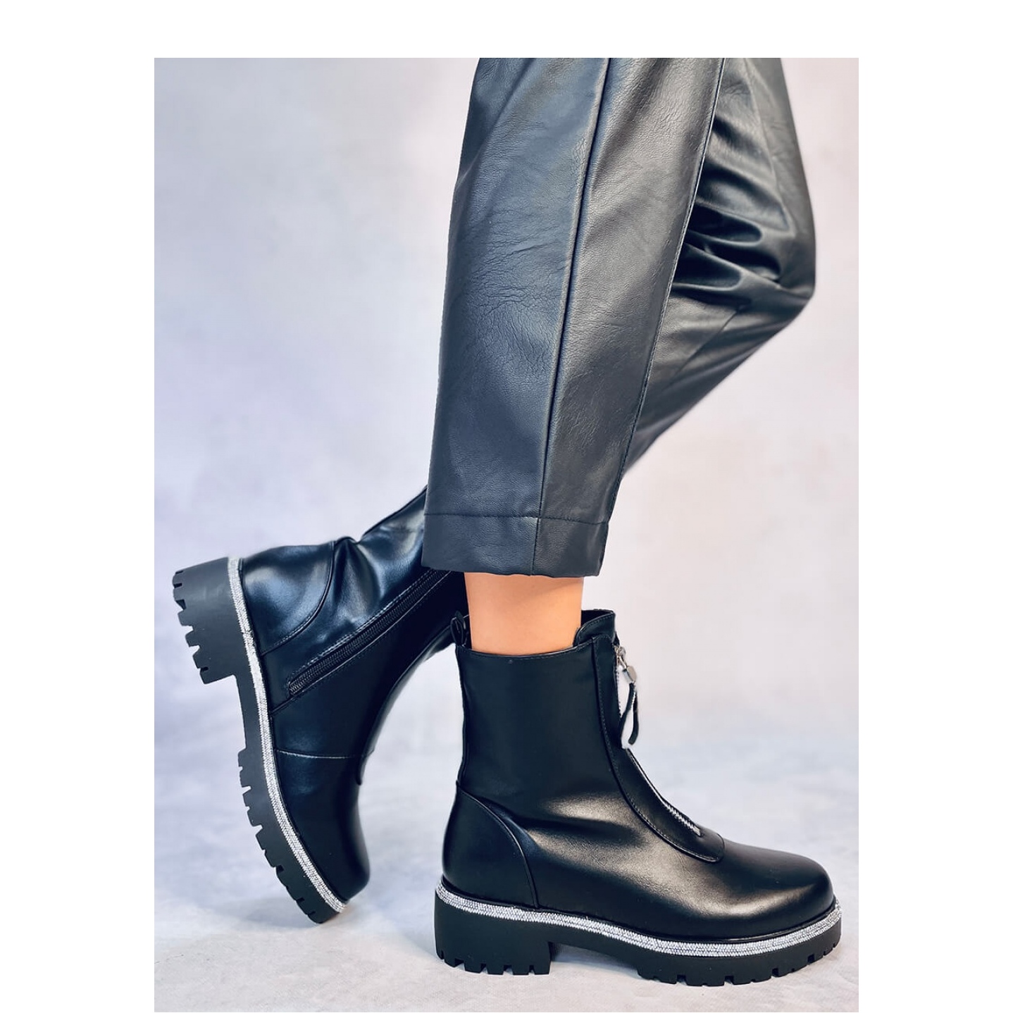 Bottines femme pleine fleur - ouvrières à semelle plate. Ils ont un design original avec une fermeture éclair argentée accrocheuse sur le devant et des zircons brillants. De plus, elles disposent d'une fermeture éclair pratique sur le côté de la tige. Savez-vous déjà quelles chaussures domineront désormais votre garde-robe ? : ) Ils sont fabriqués en cuir écologique et l'intérieur est doublé d'une fourrure délicate.