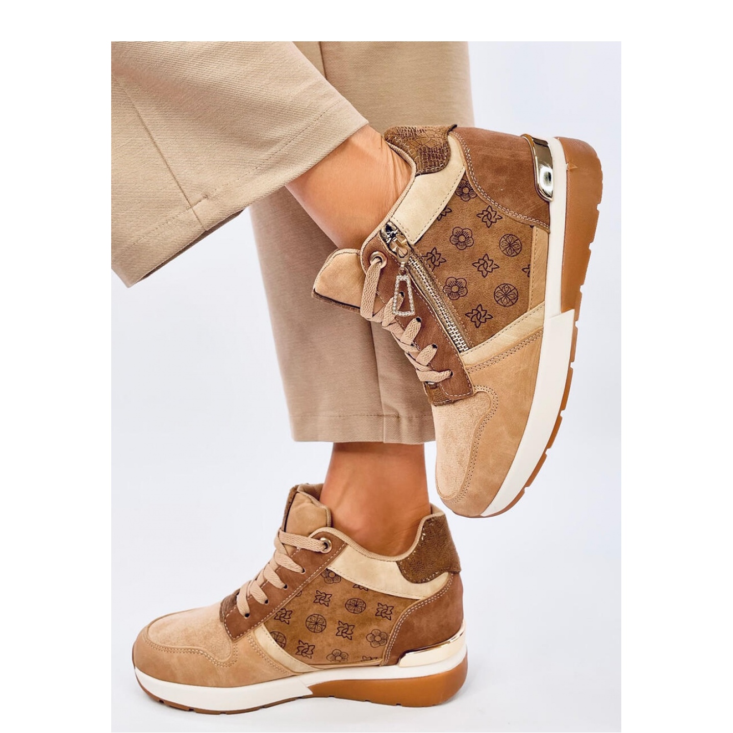 Baskets glamour pour femme avec un talon compensé de 6 cm de hauteur. Il s'agit d'un modèle unique avec un design élégant qui attirera certainement votre attention :) Non seulement ils sont superbes, mais ils sont également confortables ! Ils sont parfaits pour un usage quotidien. L'intérieur des chaussures est doublé de tissu. Matériau extérieur ? cuir écologique + daim écologique.