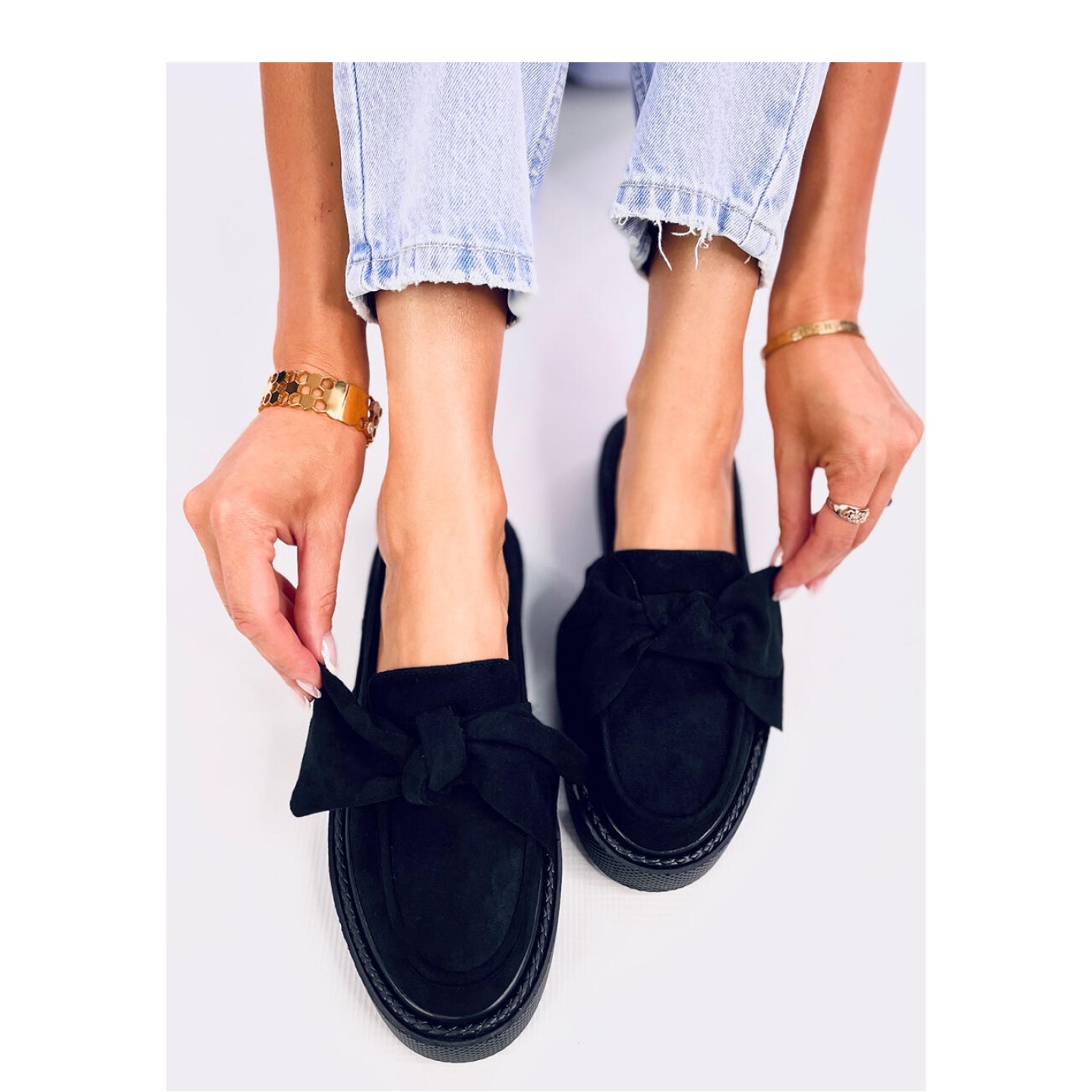 Fabriqués en daim écologique doux et durable, ils non seulement ont fière allure, mais sont également faciles à nettoyer. Leur semelle élevée avec une hauteur de 3 cm assure une excellente stabilité, ce qui les rend parfaitement collés, même dans des situations dynamiques. À l'avant de la chaussure, il y a un arc charmant qui leur donne un caractère unique et un charme féminin.