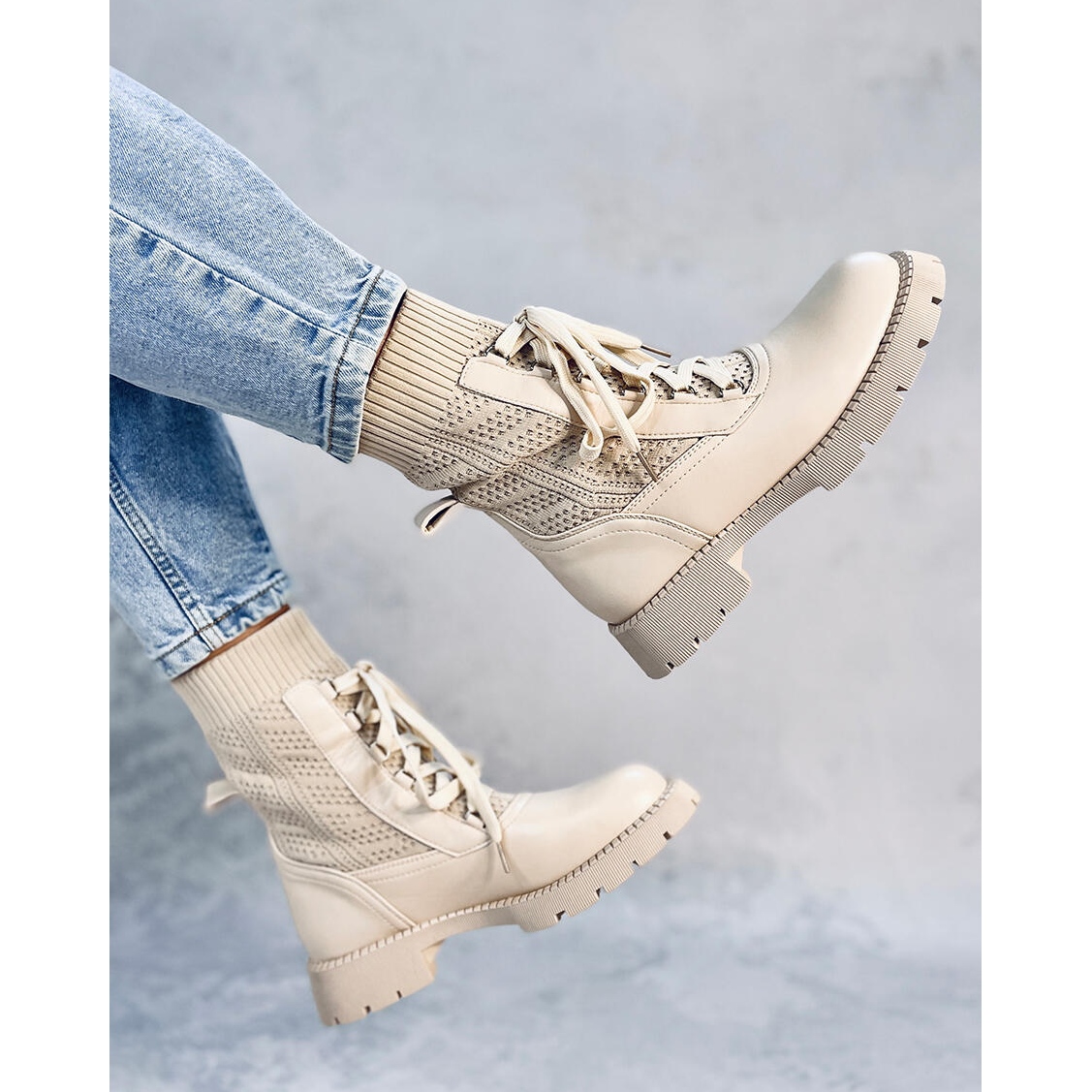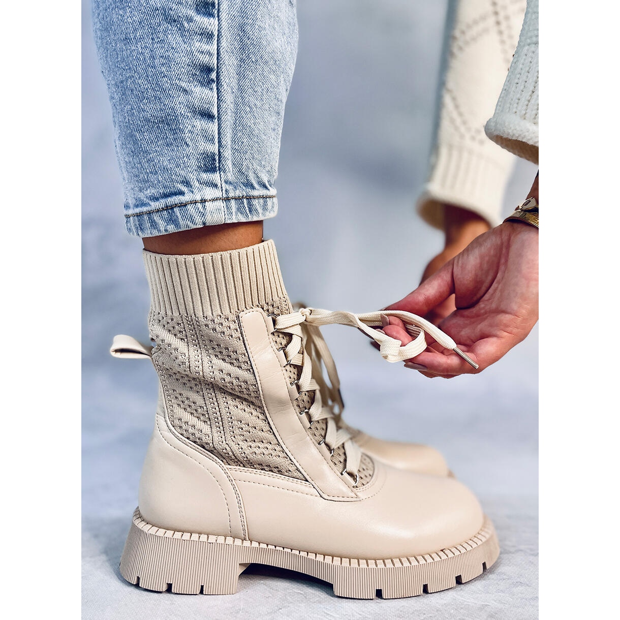 Les bottes sont des chaussures semblables à des chaussettes : elles ont une tige en pull flexible qui s'adapte parfaitement à la jambe. Ils sont ornés d'un élégant laçage sur le devant, qui leur apporte du caractère. La couleur beige permet un coiffage facile.