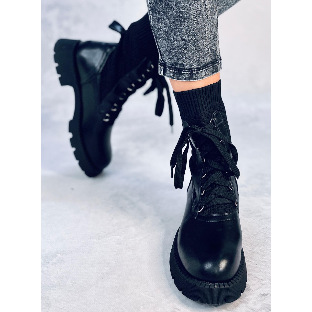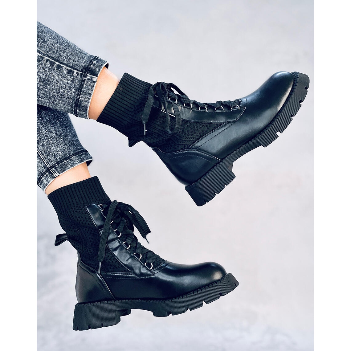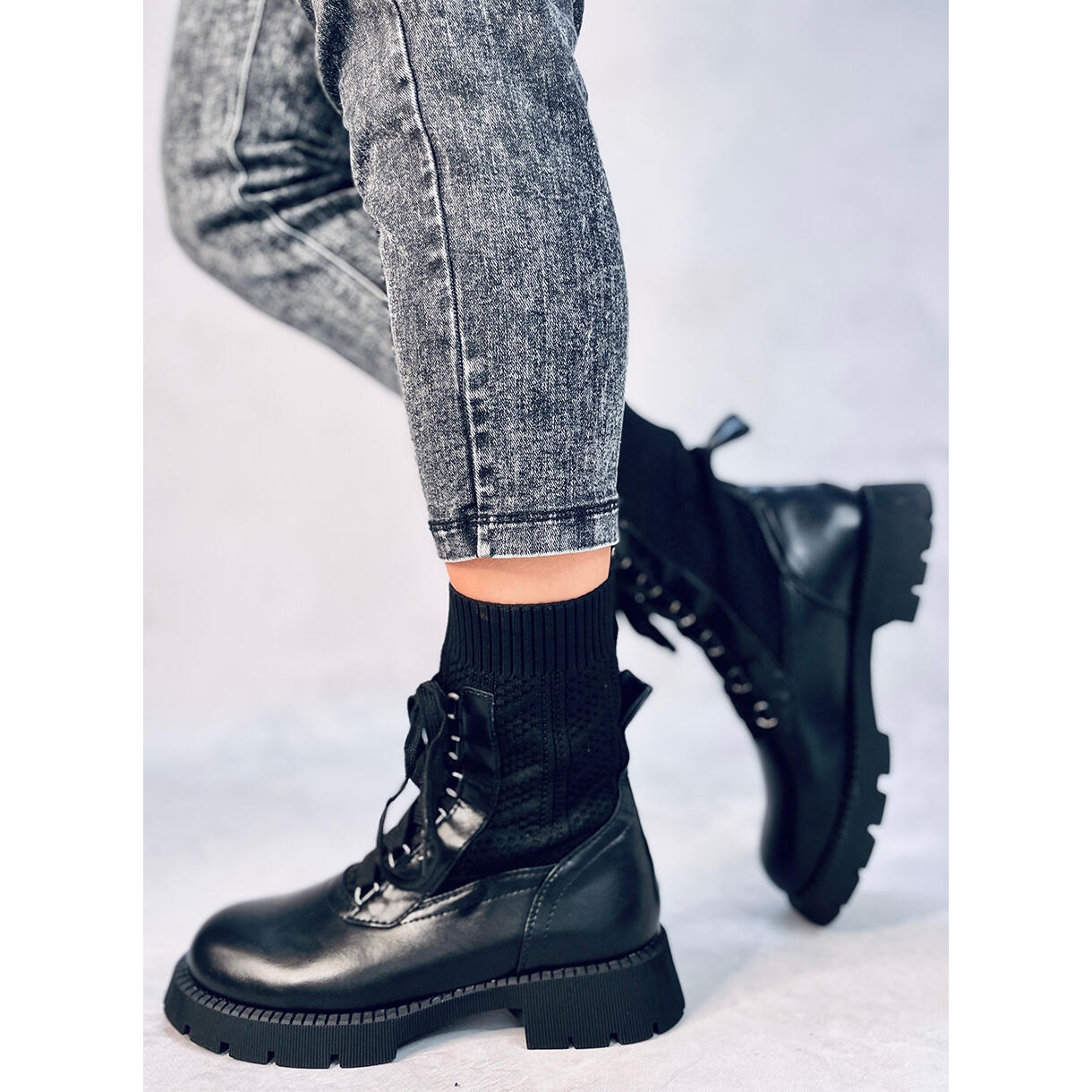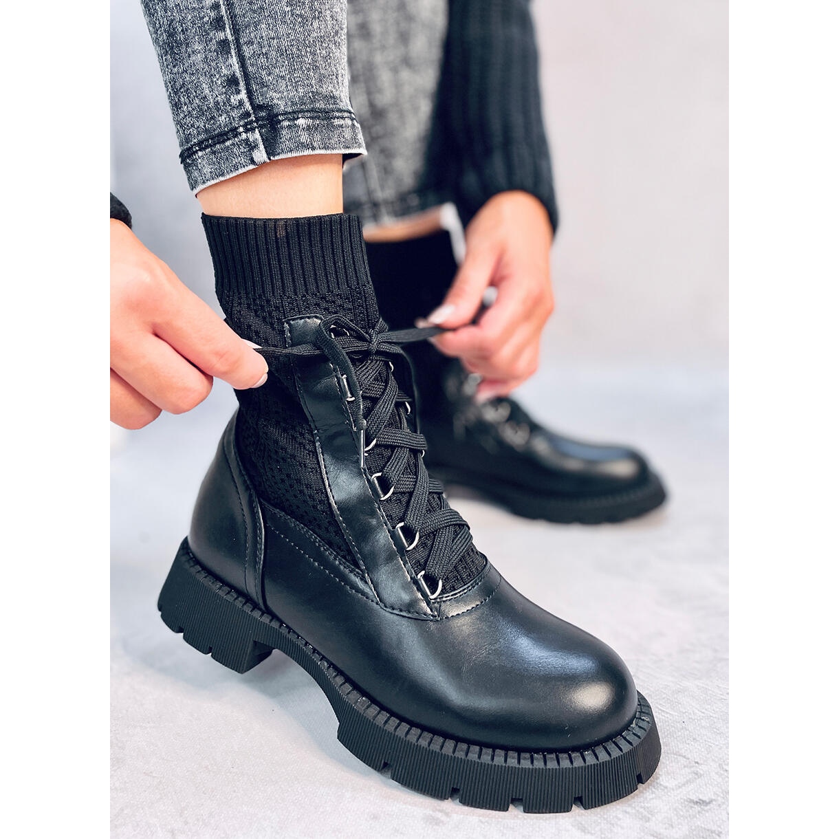 Le produit à décrire sont des bottines pour femmes de Tierr Black. Ce sont des bottes chaussettes uniques avec un talon plat, parfaites pour un usage quotidien. Leur design original associe une tige pull souple et un laçage décoratif sur le devant. Les bottes sont fabriquées en cuir et en tissu écologiques, ce qui garantit à la fois un look élégant et un confort de port.