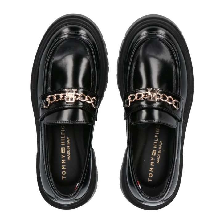 Les chaussures pour femmes de la célèbre marque Tommy Hilfiger sont des mocassins élégants de couleur noire classique qui, grâce à leur design universel, seront parfaits pour n'importe quel style. Le modèle Low Cut Shoe portant le code T3A4-33021-1453999-999 est réalisé en cuir naturel de haute qualité avec une finition brillante, ce qui leur confère un caractère noble. Un élément décoratif supplémentaire est une chaîne en or avec l'ajout TH caractéristique de la marque, soulignant le style luxueux des chaussures.
