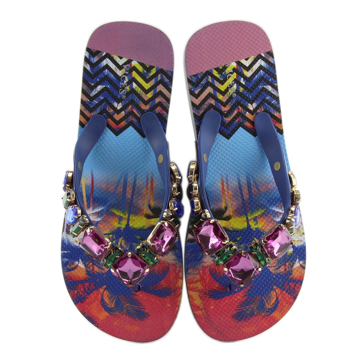 Découvrez le charme éblouissant des tongs avec 8250 pierres aux ravissantes nuances de violet et de bleu. Ces tongs uniques pour femmes sont le choix parfait pour les journées d'été, ce qui vous permettra de vous démarquer de la foule. De riches décorations sous forme de pierres multicolores et de zircons rendent chaque moment passé ici vraiment unique.