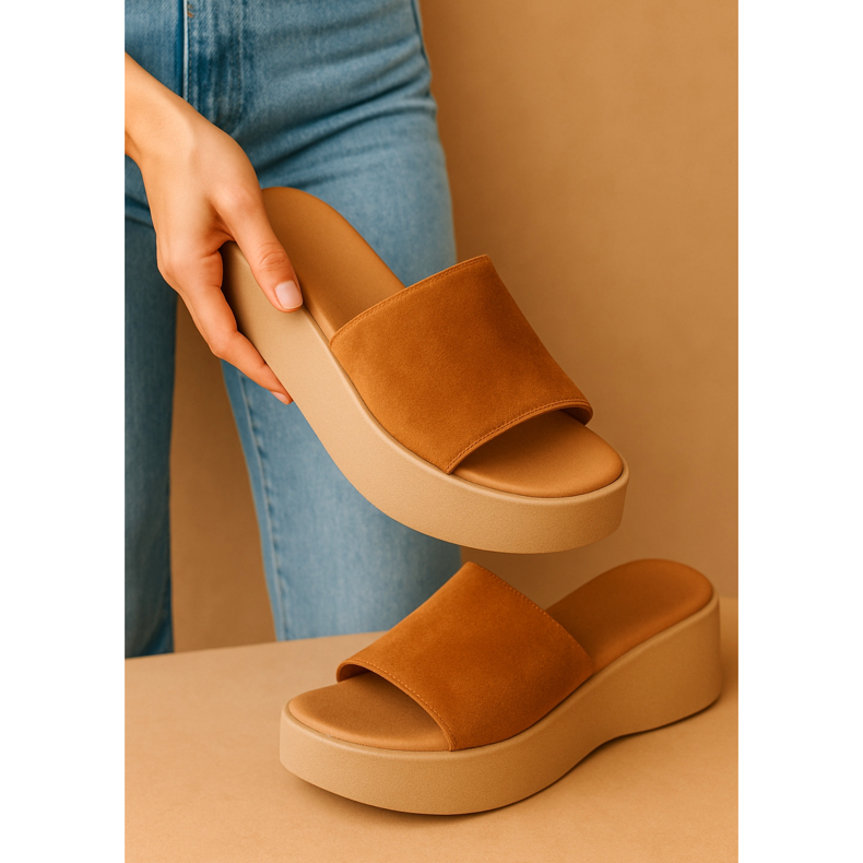 Les plateformes en daim nécessitent des soins plus délicats. Brossez-les régulièrement avec une brosse à daim en caoutchouc, qui enlèvera la poussière et soulèvera le poil de la matière. Avant la première utilisation et régulièrement tout au long de la saison, imprégnez-les d'une préparation qui protège de l'humidité et des taches. Évitez de porter des tongs en daim les jours de pluie. Si des taches apparaissent, utilisez une gomme spéciale daim ou faites nettoyer les chaussures par un professionnel.
