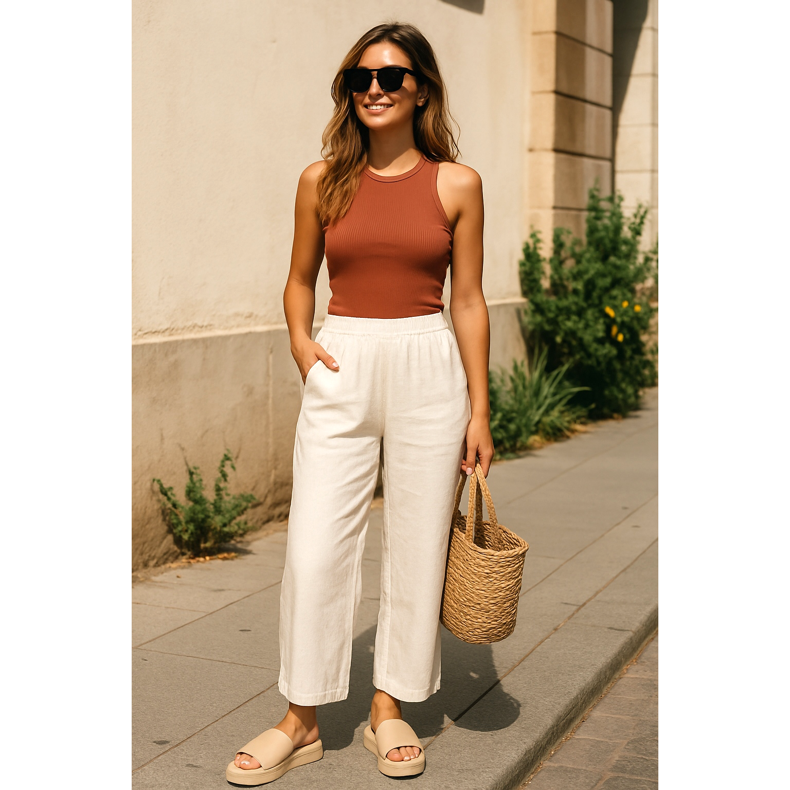 Les pantalons en lin coupe ample sont phénoménaux avec des rabats plateforme. Choisissez un pantalon blanc ou crème et associez-le à un haut ajusté de couleur contrastante, comme la terre cuite ou le vert bouteille. Ajoutez un sac en osier et de grandes lunettes de soleil. Ce style est parfait pour un déjeuner dans le jardin d'un restaurant ou pour une foire estivale en ville.