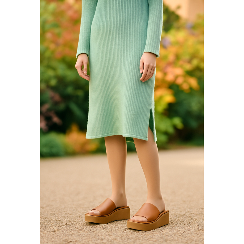 Pour profiter au maximum de cet effet, choisissez des tongs d'une couleur similaire à la teinte de vos jambes. Des plateformes couleur chair, beige ou caramel associées à des jambes exposées créeront l'illusion de membres très longs. En été, vous pouvez les porter sans collants, permettant à votre peau de bronzer et de se fondre naturellement avec la couleur de vos chaussures. Ceci est particulièrement bénéfique pour les femmes de petite taille qui souhaitent gagner quelques centimètres optiquement.