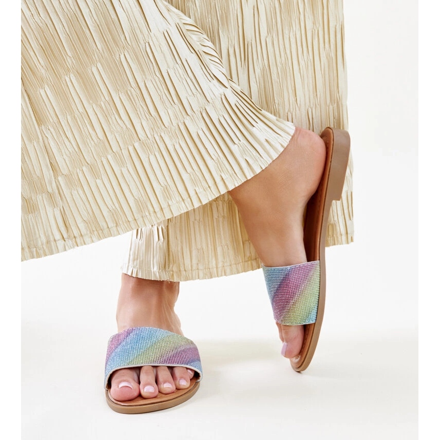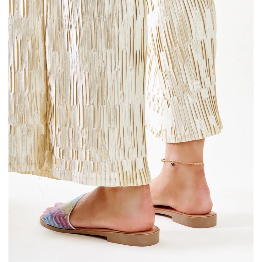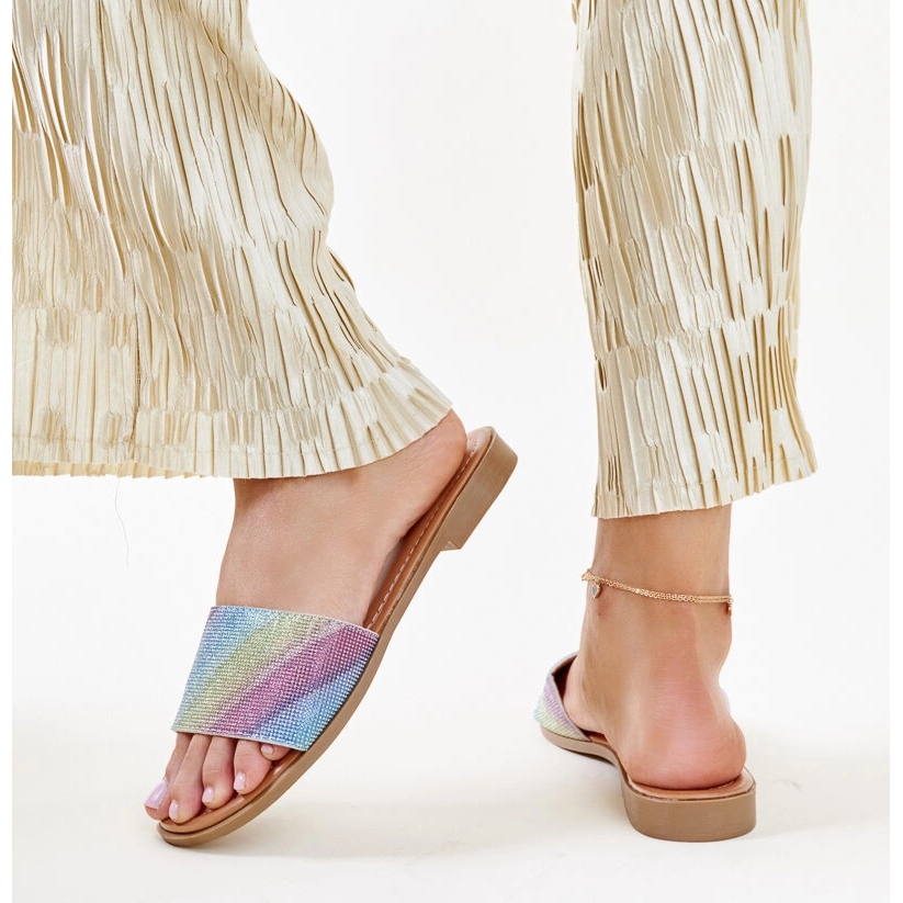Les tongs sont à enfiler, ce qui en fait un choix extrêmement pratique pour les journées chaudes. L'attrait principal de ces chaussures, cependant, ce sont les strass qui leur donnent un éclat éblouissant, parfaitement assorti au nom de couleur du fabricant - RAINBOW COLOURS. Ces accents multicolores rendent les tongs faciles à assortir avec une variété de tenues d'été, ajoutant la touche finale à n'importe quelle tenue.