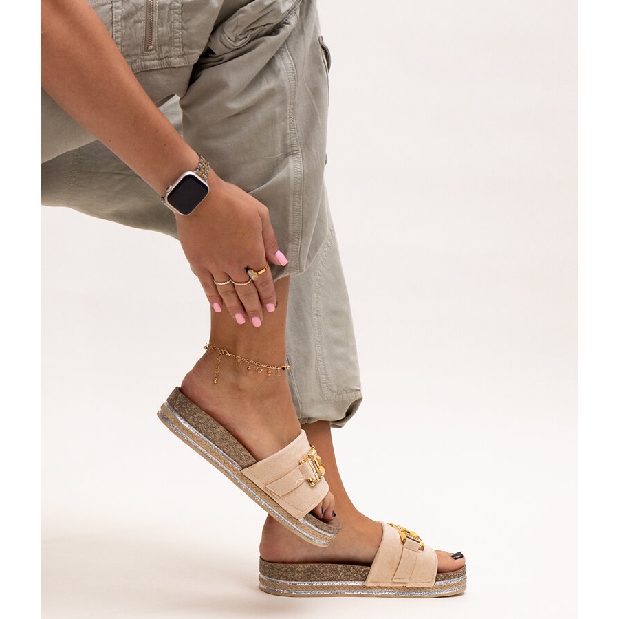 Nous présentons des tongs beige Niamh, qui deviendront certainement un élément préféré de chaque garde-robe d'été. Leur nez rond et leur design minimaliste en font une proposition idéale pour les journées chaudes, correspondant parfaitement à diverses stylisations. Les pantoufles se distinguent par une décoration élégante de la zircone et une chaîne élégante qui leur donne une lueur et des tendances uniques.