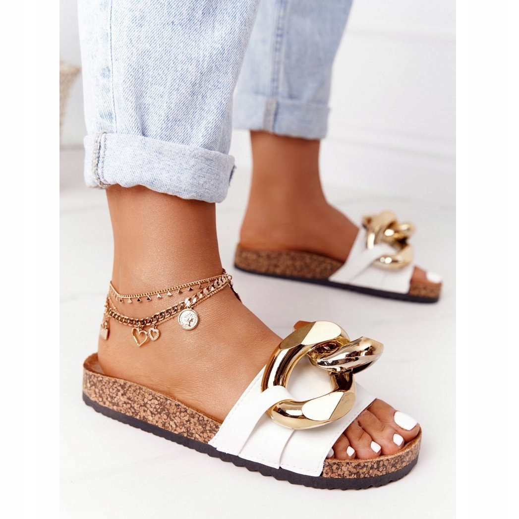 Ces tongs sont équipées d'une semelle intérieure profilée en cuir suédé écologique, qui assure un confort exceptionnel au porté. Un avantage supplémentaire est la chaîne massive, qui devient un accent accrocheur soulignant leur design moderne. Ce modèle est disponible dans des couleurs blanches classiques, ce qui en fait un élément universel de toute garde-robe.
