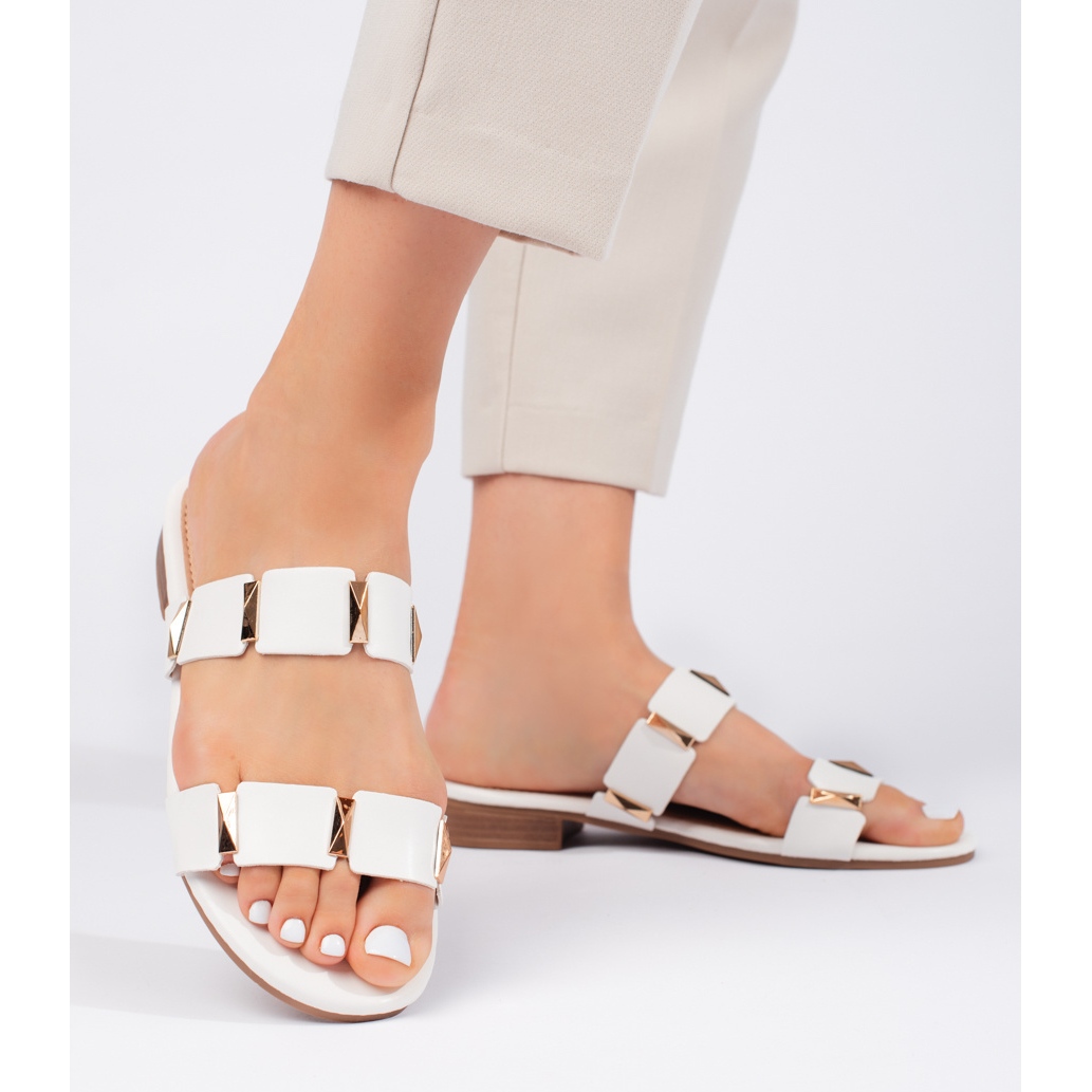 En cuir biologique, à l'extérieur et à l'intérieur, ces tongs garantissent non seulement un look élégant, mais aussi la convivialité environnementale. Les couleurs blanches avec des accents dorés subtils leur donnent un caractère unique, ce qui attirera certainement l'attention. Une semelle plate d'une hauteur de 3 cm assure le confort de porter toute la journée, et le talon ouvert fait que le putain et le décollage sont rapides et sans problème.