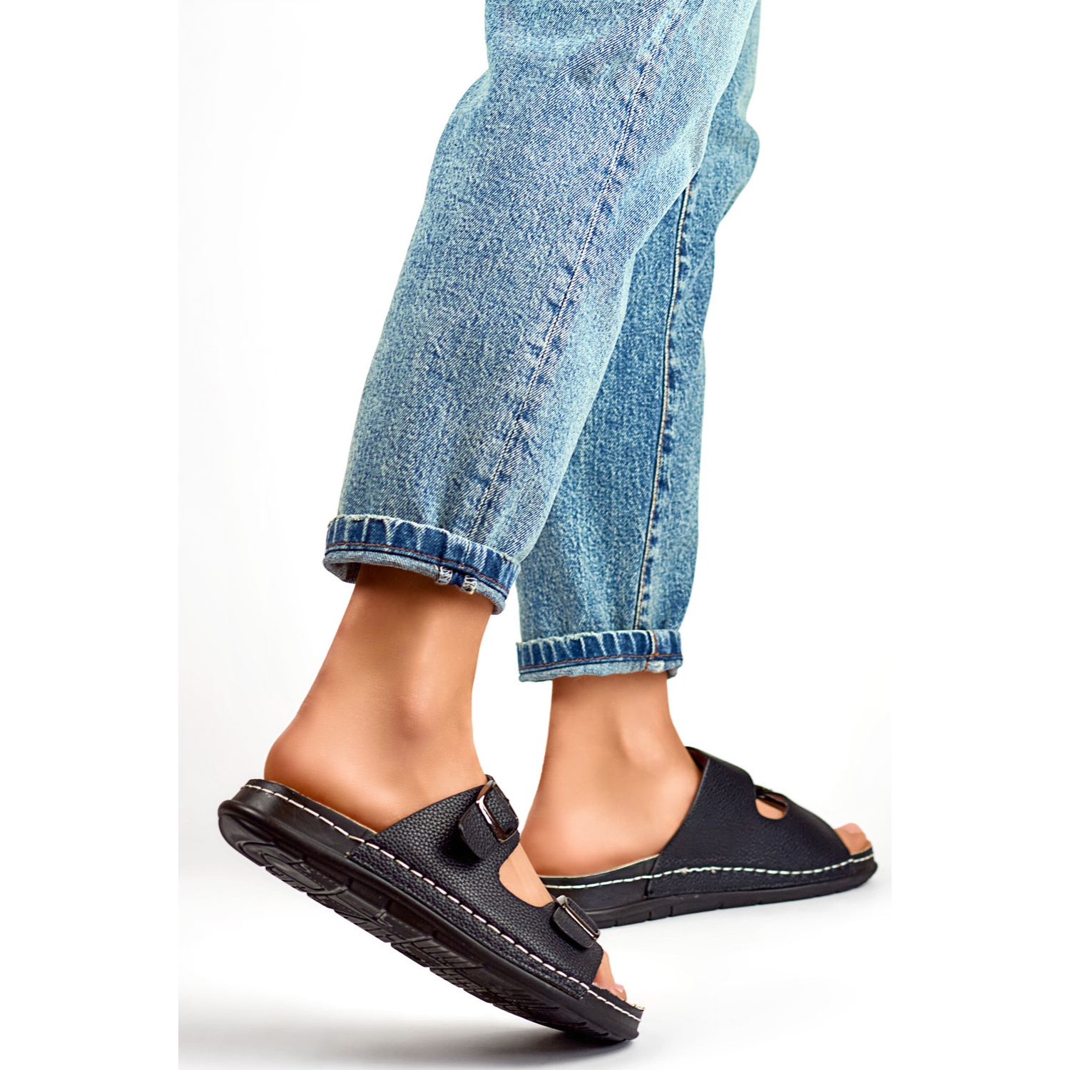 Détails: Tongs confortables noires pour femmes avec deux boucles et semelle intérieure en cuir le noir