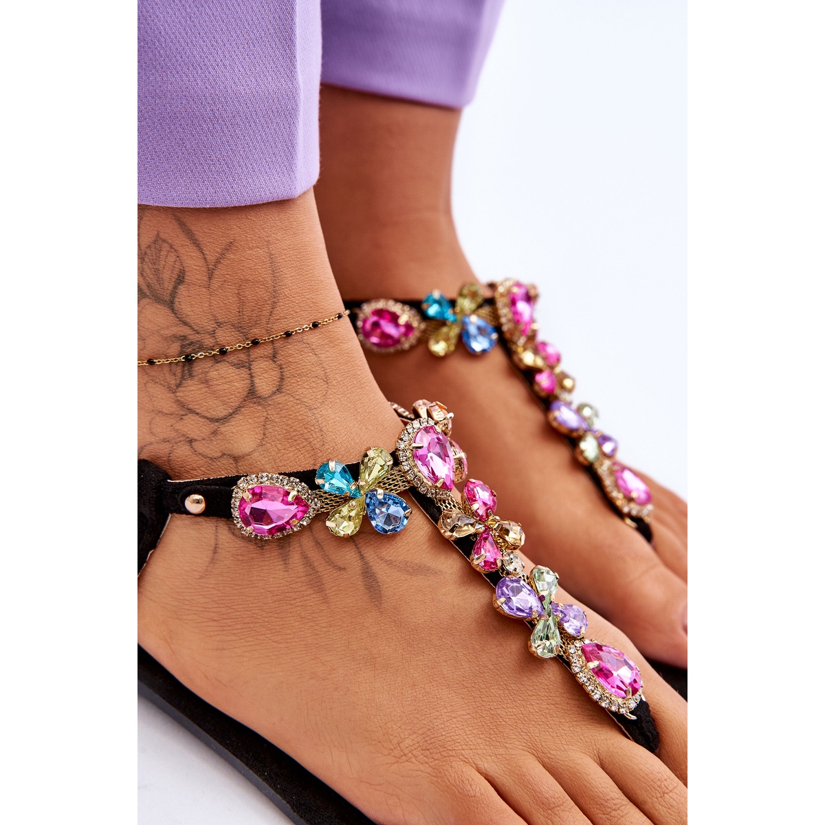 Les sandales sont fabriquées en daim écologique de haute qualité, ce qui les rend agréables au toucher et respectueuses de l'environnement. La finition noire et intemporelle en fait un complément parfait à pratiquement tous les styles d'été, et le design multicolore supplémentaire avec des pierres et des strass leur confère un caractère unique et luxueux.