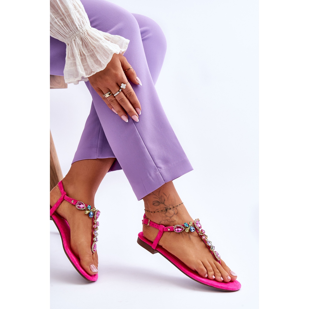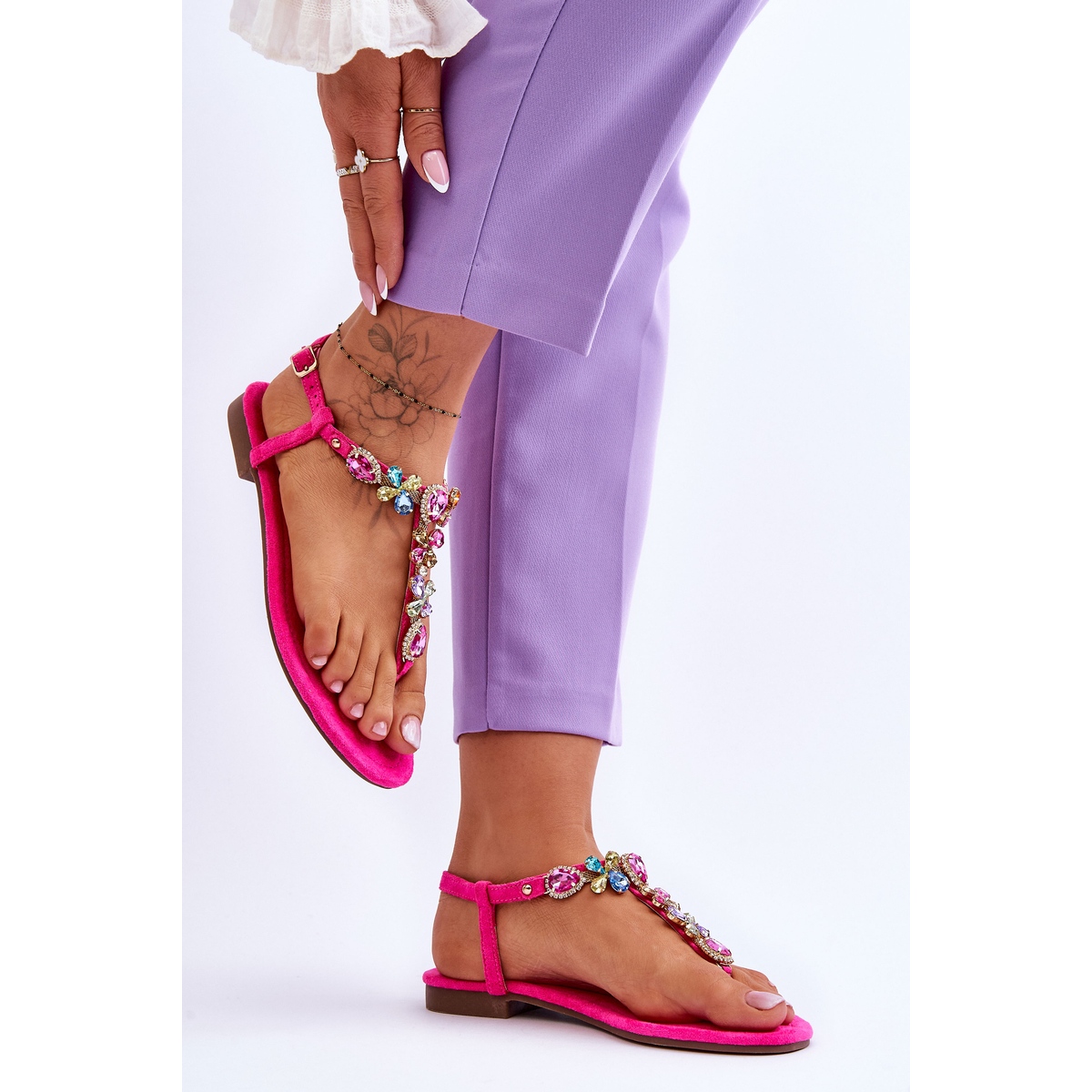Le style « tongs » est un classique qui s'intègre avec succès dans différents styles, et les réglages de taille de la sangle et de la boucle réglables permettent un ajustement parfait au pied. Le talon plat, de 1,5 cm de haut, garantit le confort, même en cas de port prolongé. Les strass supplémentaires sont une véritable touche qui augmente la valeur esthétique et font de ces sandales un élément parfait de votre garde-robe estivale.