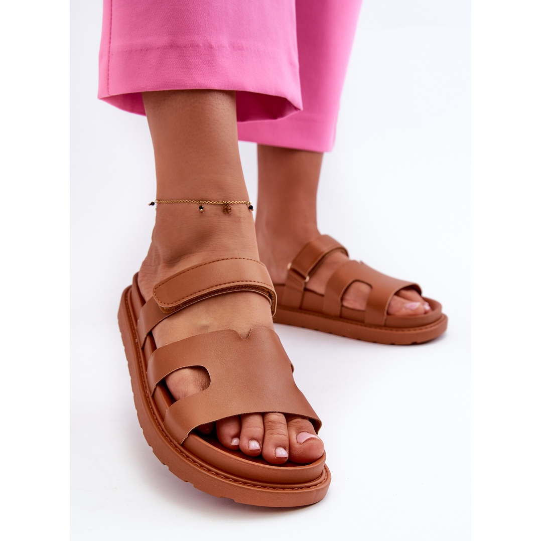 Les tongs fermeture scratch en cuir écologique pour femmes de couleur marron se marient parfaitement avec les styles d'été et leur design universel les rend assorties à presque toutes les tenues. Il est à noter que ce modèle n'a pas de nez, ce qui augmente la sensation de liberté et de fraîcheur lors des journées chaudes.