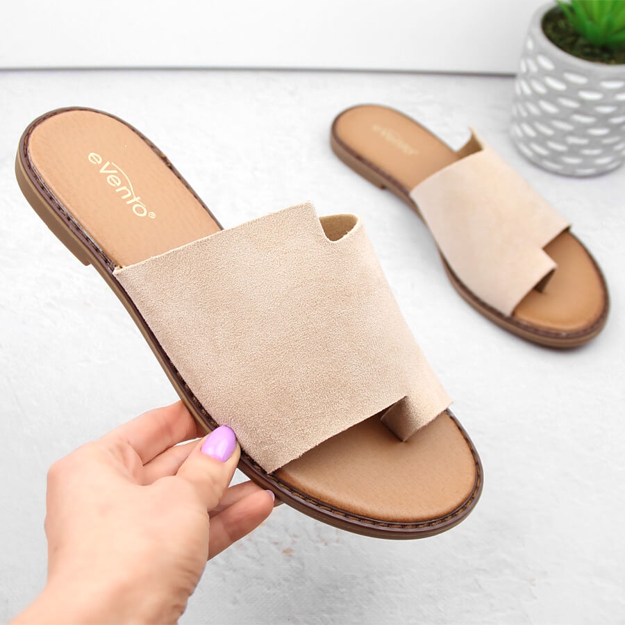 Nous vous présentons les tongs pour femmes en daim beige du fabricant eVento, modèle 4586. Ces tongs élégantes et confortables sont le choix parfait pour les journées d'été, assurant un confort de port inégalé grâce à l'utilisation de matériaux de haute qualité.