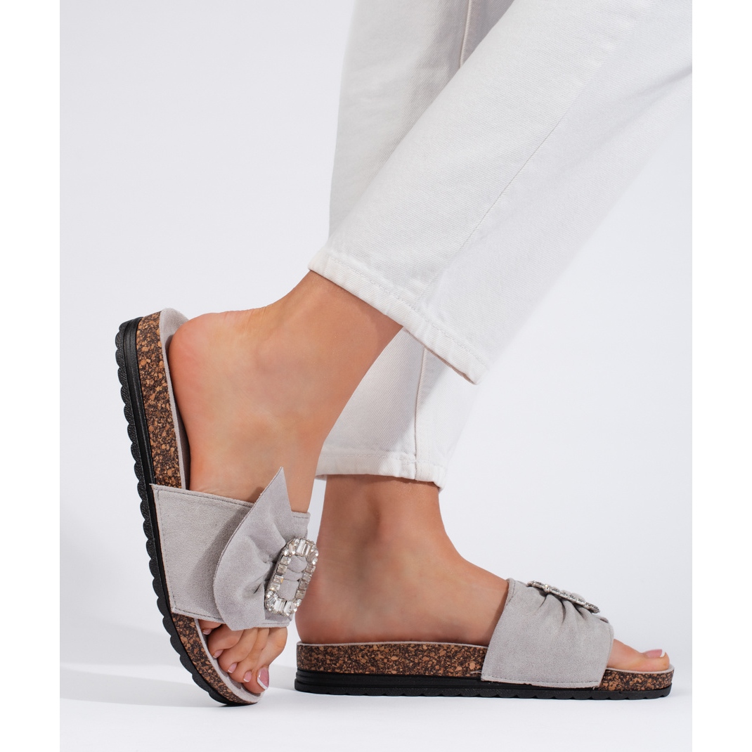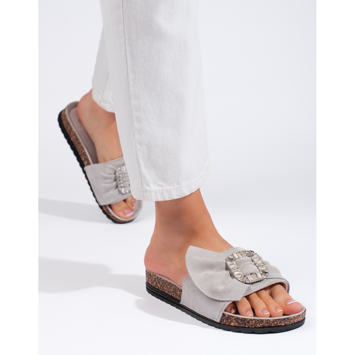Conçues dans un souci de confort, les claquettes sont dotées d'un bout et d'un contrefort de talon ouverts pour plus de liberté et de respirabilité. Fabriqué en cuir suédé écologique, non seulement beau, mais également respectueux de l'environnement. Un avantage supplémentaire réside dans les zircons délicats qui leur donnent un éclat unique.