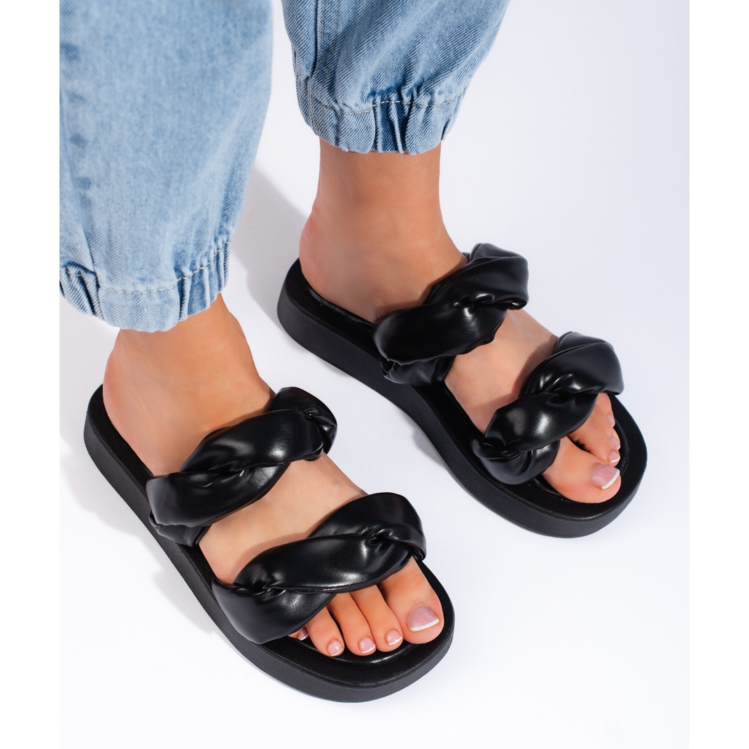 Les tongs noires à semelle épaisse sont un choix parfait pour toute femme à la mode qui valorise non seulement l'apparence, mais également la qualité et le confort de port. Ils constituent un choix idéal aussi bien pour les amateurs de solutions classiques que pour les femmes qui aiment souligner leur caractère individuel dans leur style de tous les jours. La fermeture à enfiler et le talon ouvert les rendent faciles à enfiler et à enlever, ce qui les rend encore plus pratiques.