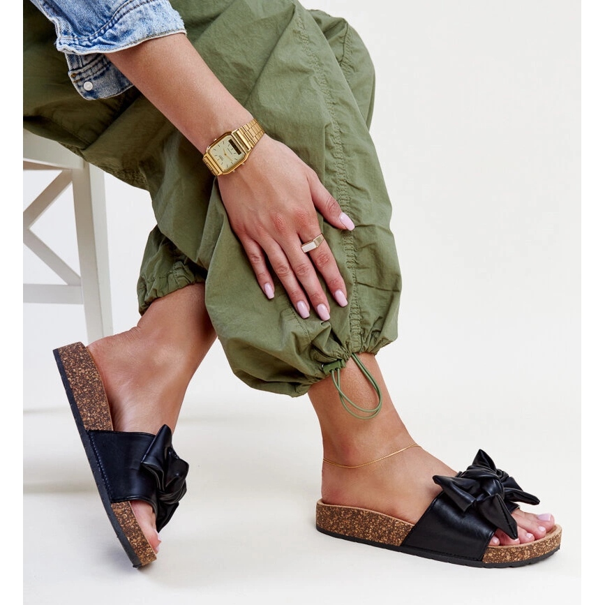 Détails: Tongs noires avec semelle en liège et nœud Petresa
