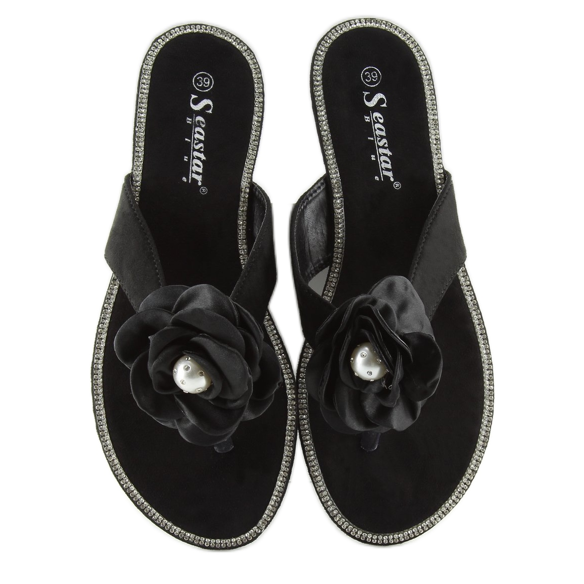 Découvrez les gracieuses tongs noires CK31P qui complèteront parfaitement votre garde-robe estivale. Ces chaussures pour femme impressionnantes se distinguent non seulement par leur design tendance, mais aussi par leurs détails élégants. Il y a une charmante fleur avec une perle sur le devant, ce qui leur donne un caractère unique. La semelle ornée de minuscules zircones cubiques ajoute une touche de luxe et rend ces tongs accrocheuses.