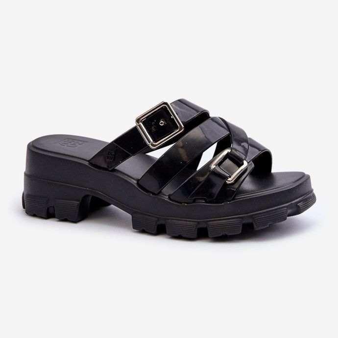Le talon bas sous la forme d'un bloc haut de 6 cm garantit la stabilité et le confort de porter même tout au long de la journée. Grâce à l'insert en plastique souple, chaque instant passé dans ces tongs sera un plaisir. L'insert et la semelle en durabilité et confort de garantie en plastique de haute qualité, et leur design noir minimaliste en font un complément parfait à chaque stylisation de l'été.