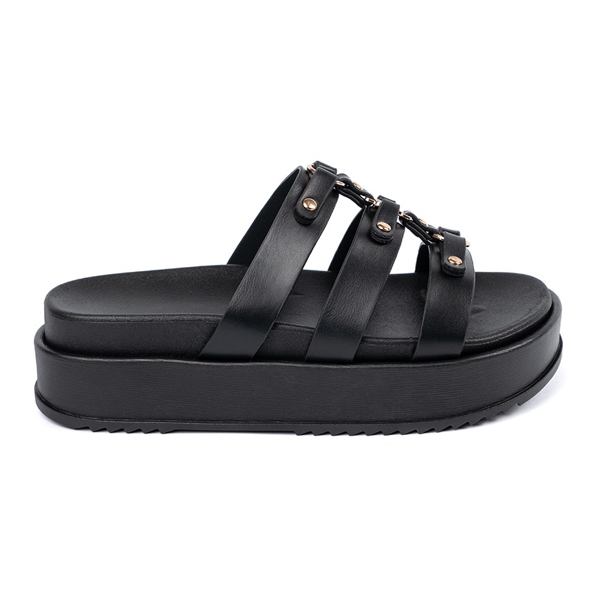 Une fixation ouverte et un fermoir coulissant assurent la facilité de mise en place, ce qui est extrêmement pratique dans un style de vie dynamique. La plate-forme de 4 cm de haut ajoute non seulement la classe, mais aussi le confort, ce qui fait que les tongs sont portés pendant des heures sans se sentir fatigué. Une semelle en plastique solide est résistante à diverses conditions météorologiques, ce qui en fait un choix idéal pour diverses aventures d'été.