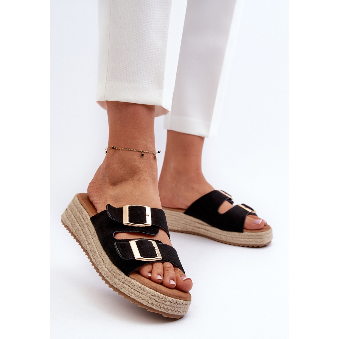 Ce modèle est intégré sur une plate-forme stable et un coin léger de 3 cm de haut, qui garantit le confort à chaque occasion. Deux sangles réglables avec des pinces à l'avant vous permettent de correspondre parfaitement à chaque pied, ce qui est particulièrement important dans le cas d'un port plus long. Les volets sans nez leur donnent la légèreté et le caractère moderne.