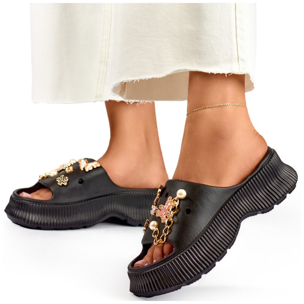 Détails: Tongs pour femmes en caoutchouc noir avec décorations