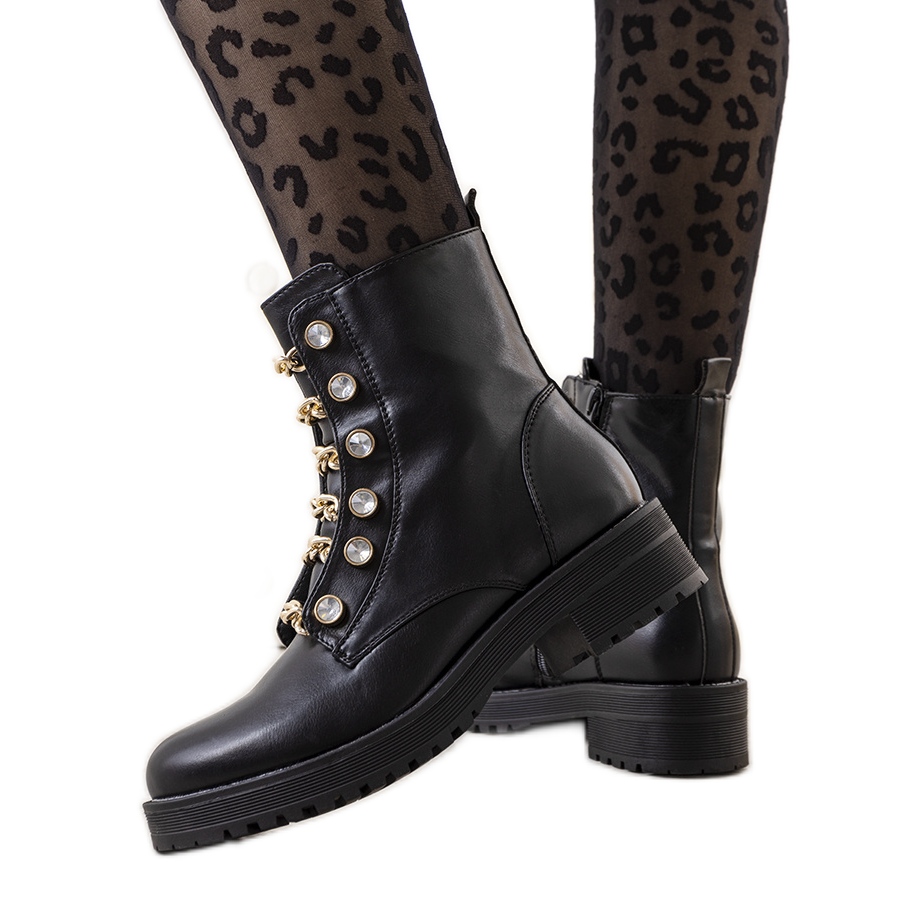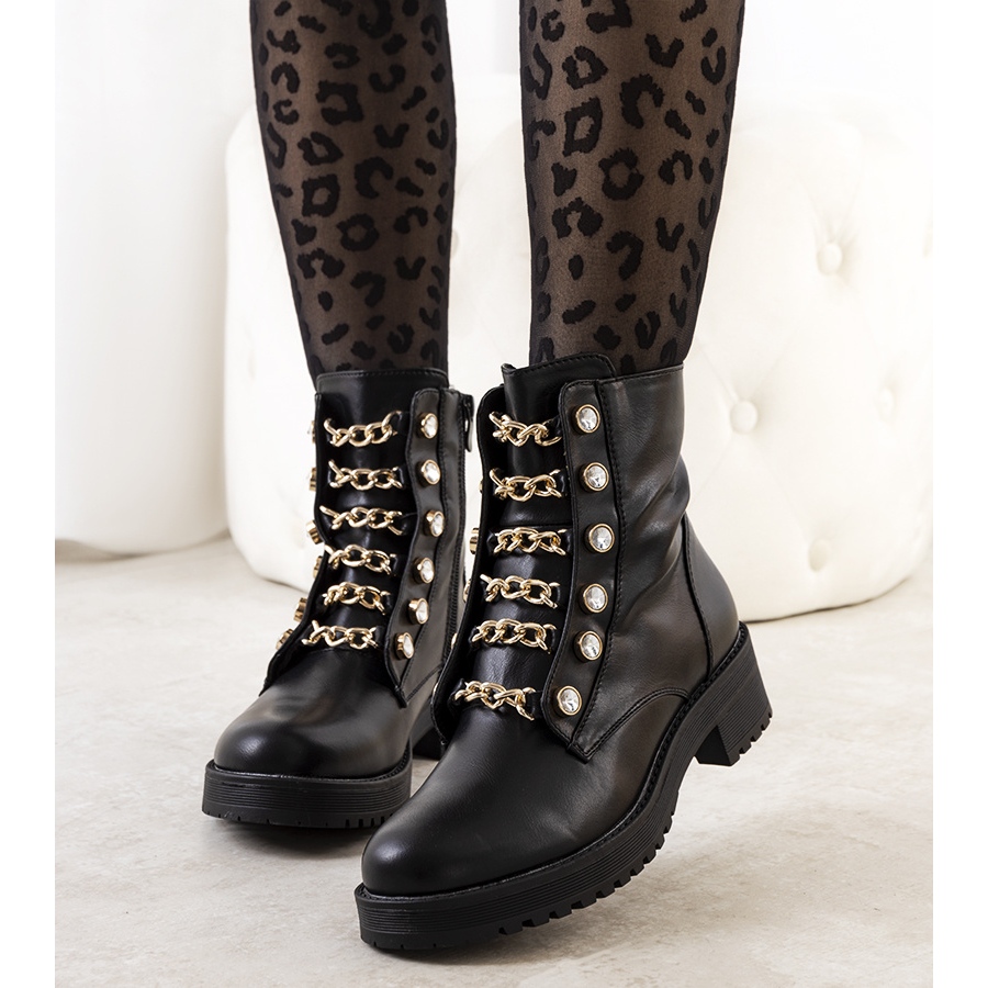 Découvrez le dernier modèle de pièges Curiel de la marque PA1 - le choix parfait pour chaque femme à la mode ! Ces élégantes bottines noires allient style et confort, ce qui en fait un élément indispensable de votre garde-robe automnale. Une chaîne dorée imitant des lacets et de subtils strass leur confèrent un caractère unique qui attirera certainement les regards.