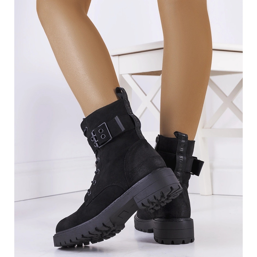 Black Tarrin Trappers - Bottes pratiques et élégantes qui fonctionneront les jours plus frais. Fabriqué en écos en daim, isolé et intégré sur une semelle à la mode et épaisse avec un protecteur, ils combinent le confort avec un caractère urbain. Ils ont un nez arrondi, ils sont attachés à la fermeture à glissière à l'intérieur, en outre entièrement lacés sur le devant et décorés d'une ceinture avec une boucle dans la couleur supérieure. Un talon plat avec une hauteur de 4 cm assure la stabilité lors d'un usage quotidien.