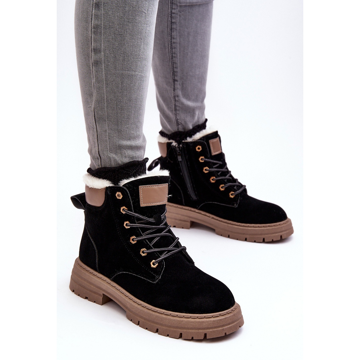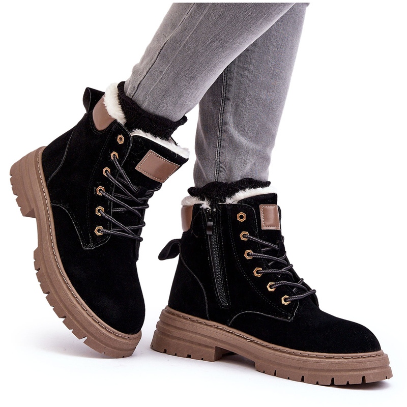 Classique, élégant et chaleureux - parfait pour les jours plus frais. Ces bottes de femmes en cuir écologique de haute qualité combinent le confort avec une apparence à la mode: intégrée sur une plate-forme stable et des talons plats, zippé sur le côté et en plus de lacets. L'intérieur rembourré avec une fourrure épaisse offre un réchauffement agréable, grâce à laquelle les chaussures fonctionneront en automne / hiver.