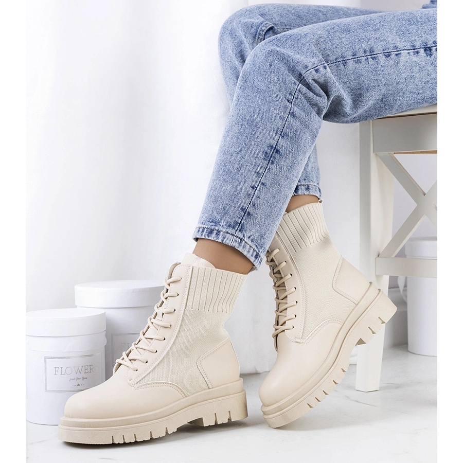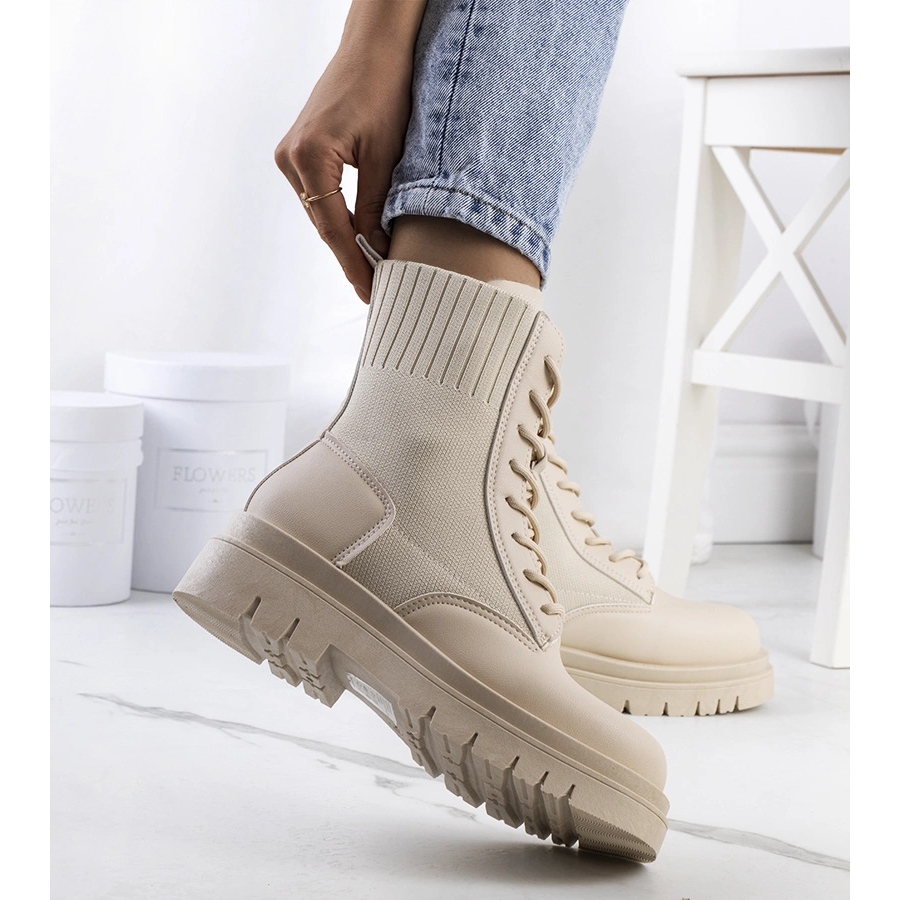 Lennon Beige Trappers est des travailleurs modernes qui mettront l'accent sur la nature des stylisations décontractées et plus modérées. La tige de la cheville est faite de matériau élastique et rayé s'adapte bien à la jambe, tandis que le reste de la chaussure est en cuir écologique de haute qualité. Modèle attaché à l'avant pour les lacets dans une couleur assortis, incrusté sur une semelle massive et plate avec des découpes - parfait tous les jours. Modèle non isolé.