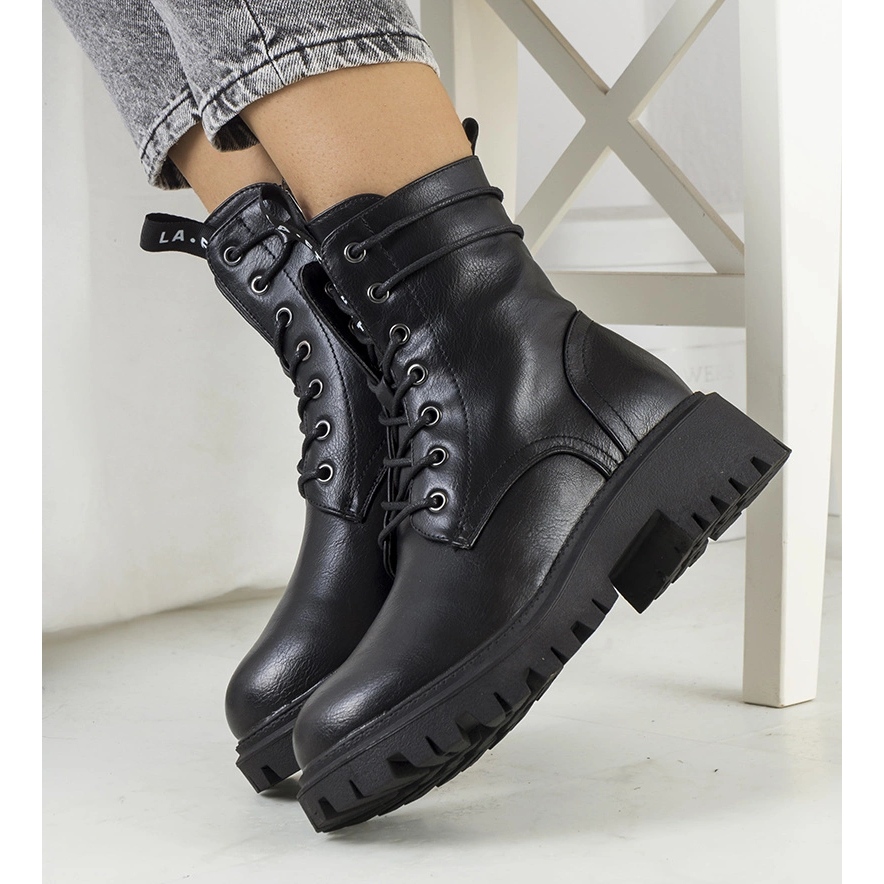 Les baskets noires se caractérisent par un bout rond et un talon plat d'une hauteur de 4,5 cm, qui assure stabilité et confort au porté. La hauteur des chaussures dépasse la cheville, ce qui met joliment en valeur la silhouette.