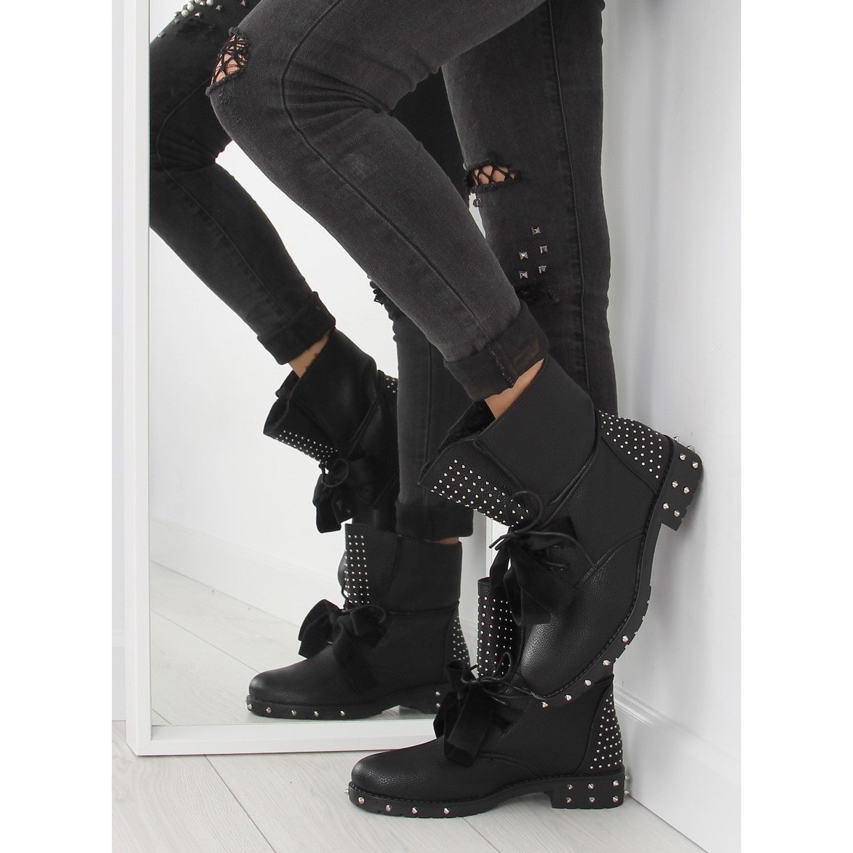 Un trait caractéristique de ces ouvriers est un nœud en satin, qui ajoute de la subtilité, et des strass argentés sur la languette et à l'arrière de la tige ajoutent un peu de style rock. La semelle cloutée confère aux chaussures un caractère unique, soulignant parfaitement votre personnalité.