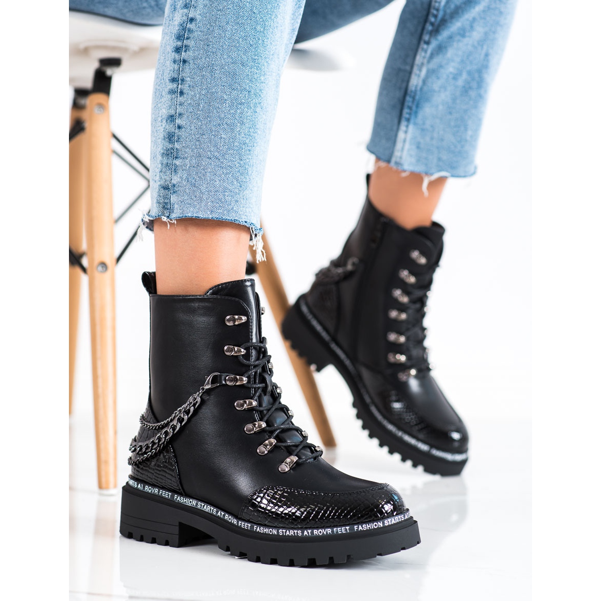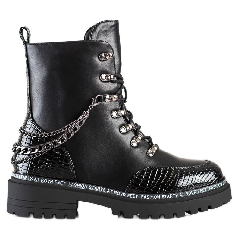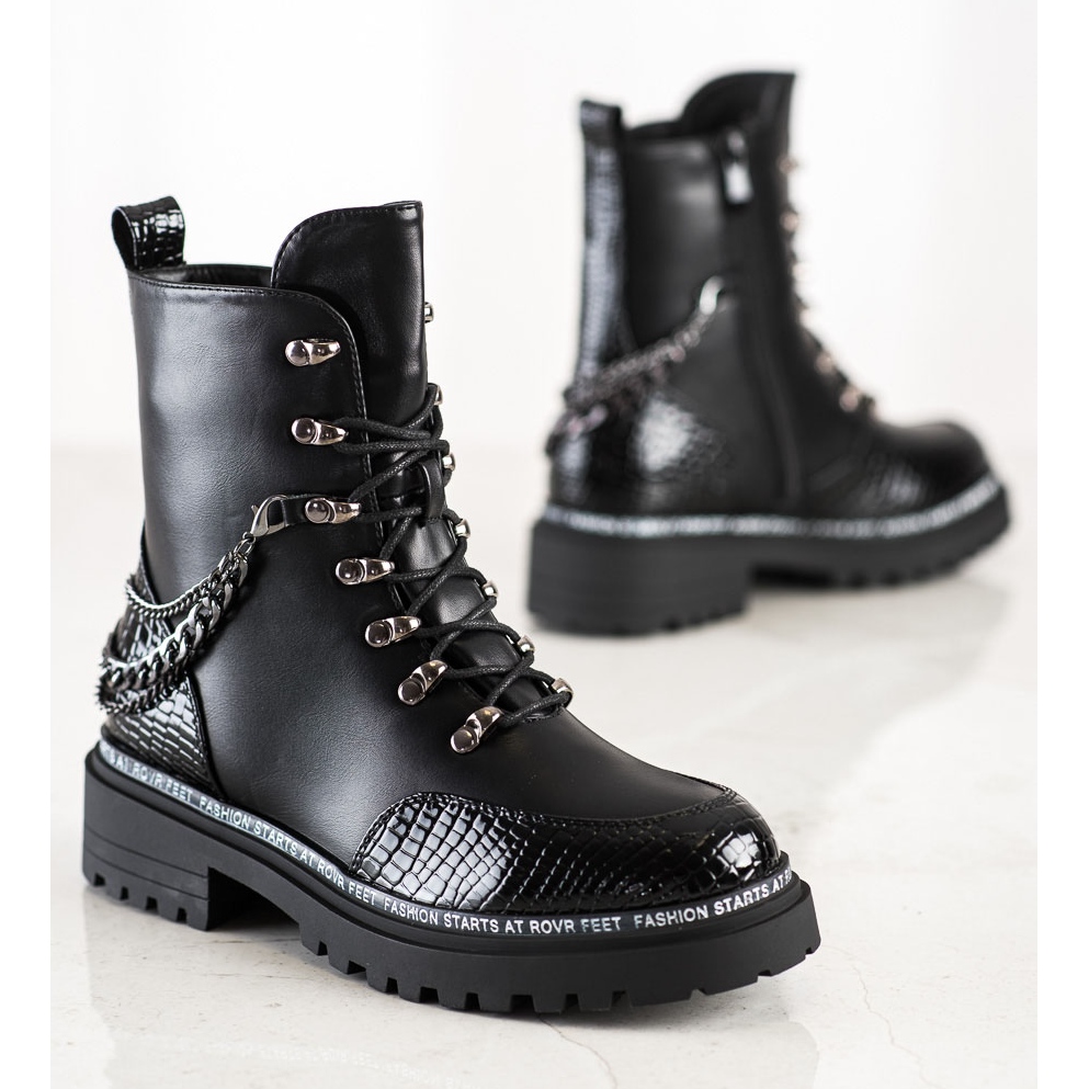 Fabriqués en cuir écologique de haute qualité, ils se caractérisent par un aspect solide et élégant. La chaîne décorative leur donne un accent unique qui attire le regard. Les ouvriers disposent d'une fermeture éclair et d'un laçage qui assurent un ajustement parfait au pied. Le talon intégré et renforcé augmente en outre le confort de port et l'isolation garde vos pieds au chaud même par temps froid.