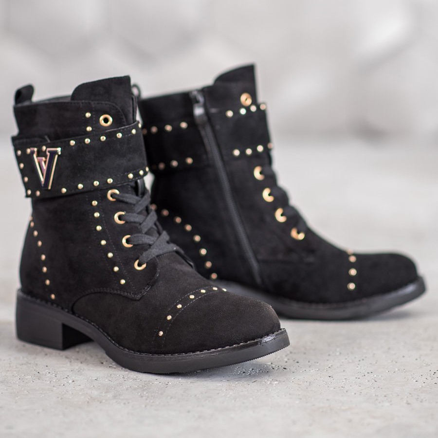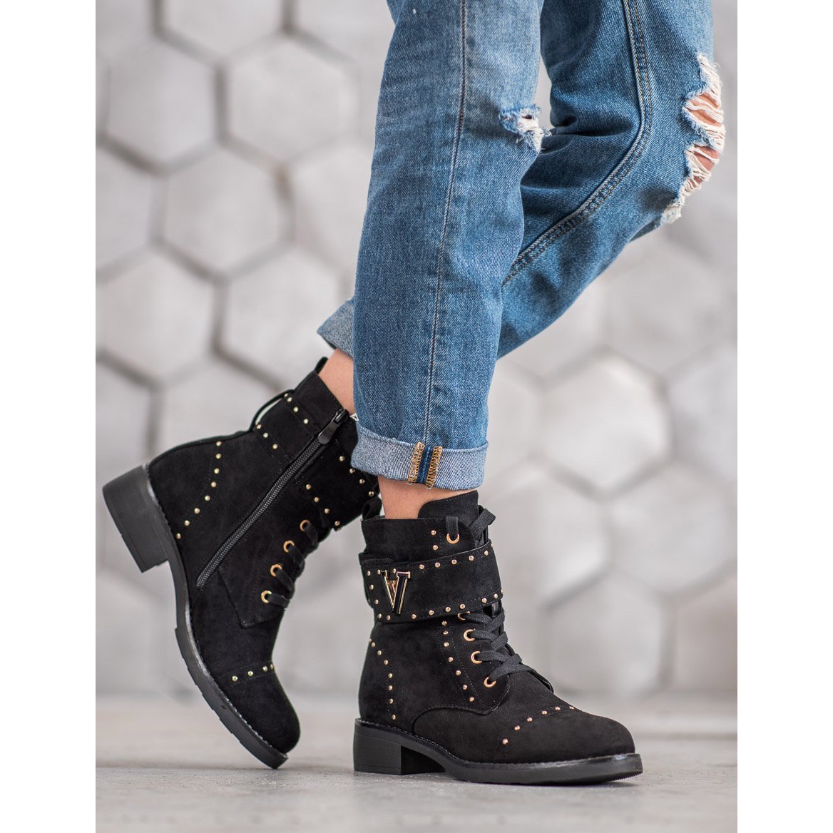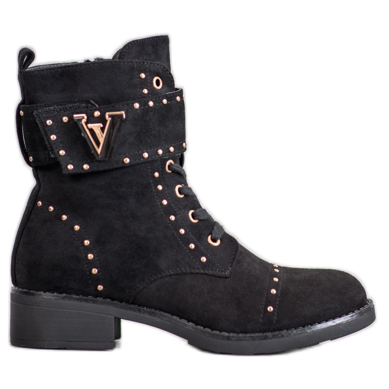 Ces élégantes bottines pour femmes sont fabriquées avec précision dans un matériau simili-cuir noir de haute qualité imitant le daim. L'esthétique et les détails vont de pair avec la fonctionnalité : sur la surface des chaussures, l'attention est attirée par des strass dorés à la mode disposés selon un motif intéressant, ajoutant du caractère à n'importe quel style.