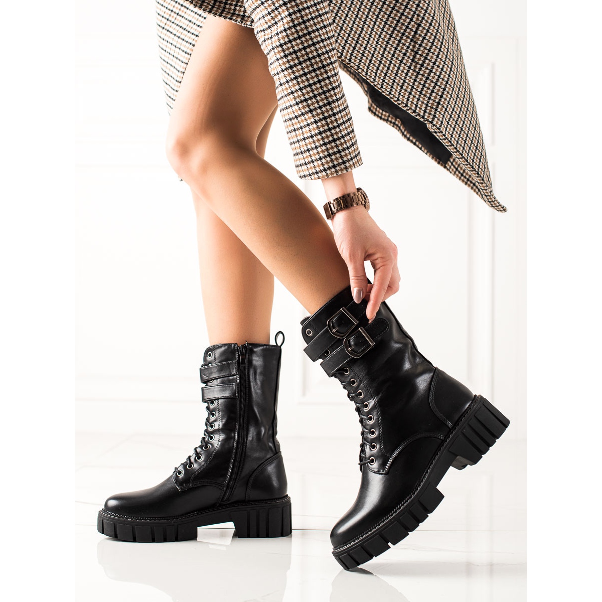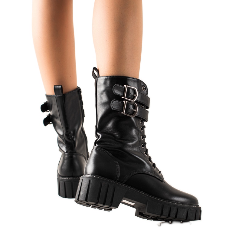 Les bottes de travail noires se distinguent par une boucle décorative, qui leur donne un peu de caractère et en fait un complément attrayant à n'importe quelle tenue. Grâce à la tige haute, arrivant au-dessus de la cheville, et à la plateforme de 3 cm de hauteur, elles constituent un excellent choix pour les journées les plus froides.