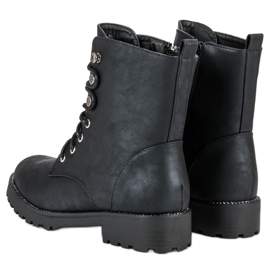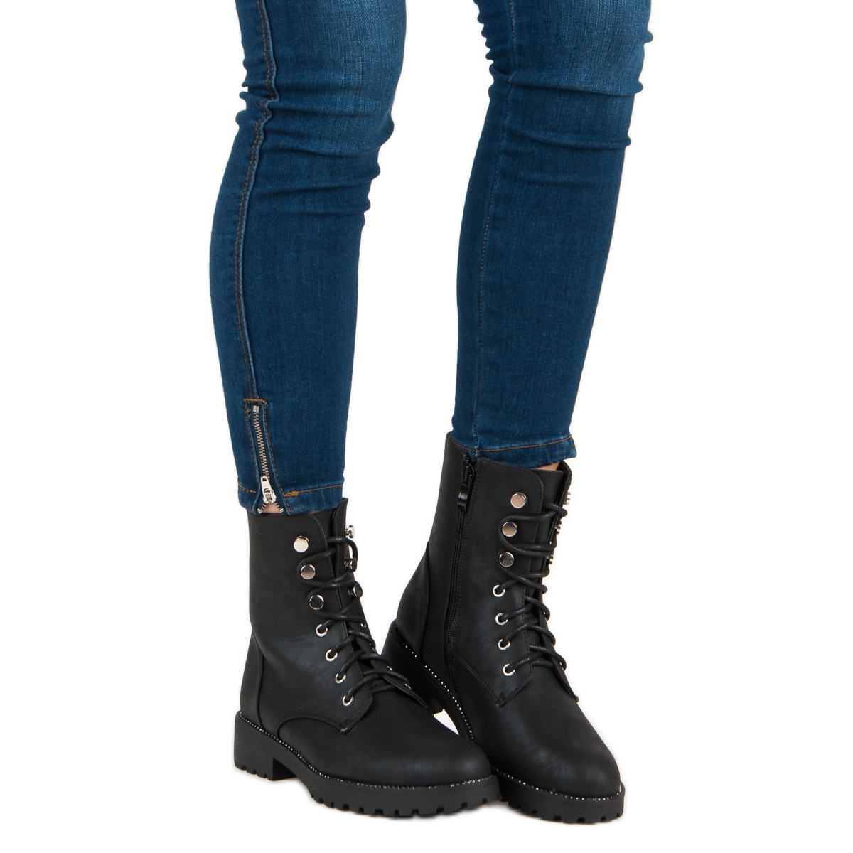 Parfaits pour l'automne et l'hiver, ces ouvriers s'adaptent à de nombreux styles du quotidien, notamment dans un style rock. Un avantage supplémentaire sont les strass qui leur donnent un aspect caractéristique et original. Le talon plat de 4 cm de hauteur garantit le confort à chaque pas, et le bout rond ajoute de la subtilité.