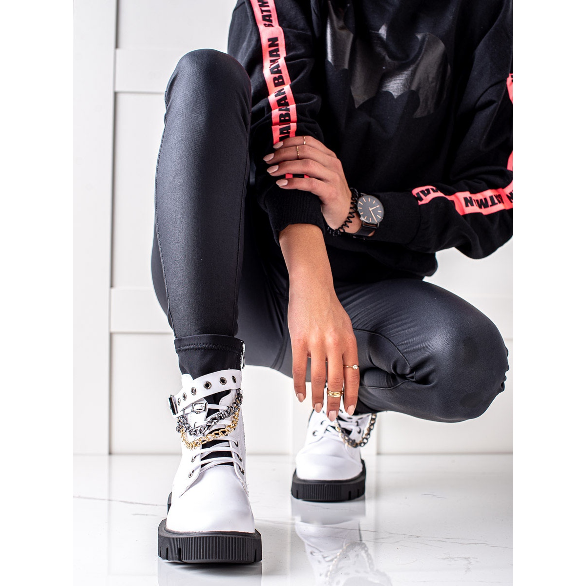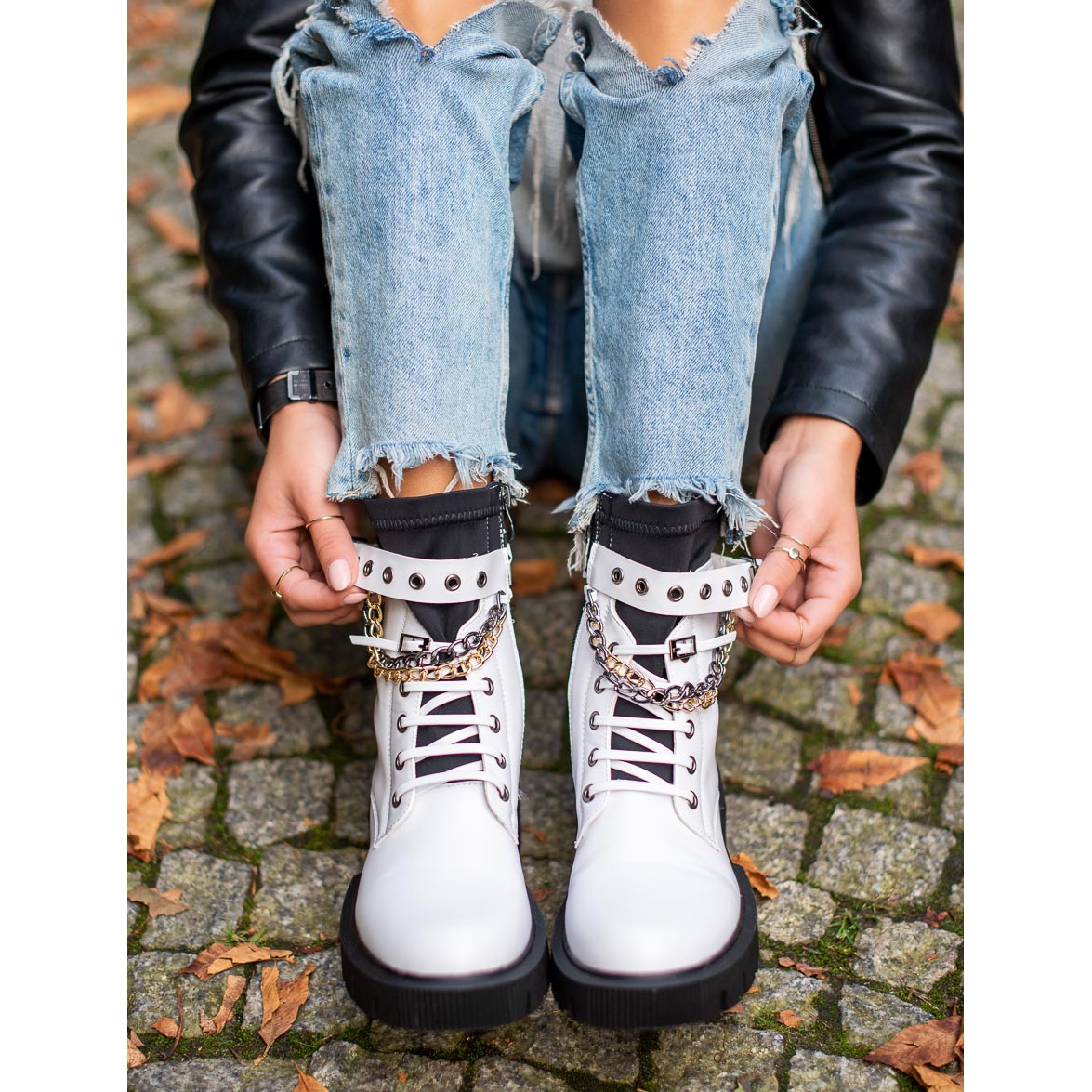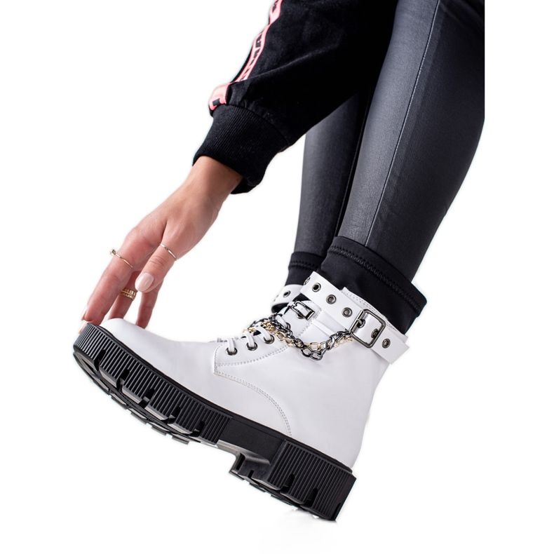 Le modèle est fabriqué en cuir écologique de haute qualité, ce qui non seulement souligne son aspect tendance, mais le rend également respectueux de l'environnement. Une doublure textile douce et une isolation intérieure garantissent chaleur et confort lors des journées les plus froides. Le bout rond ajoute un charme classique, et les boucles et chaînes décoratives ajoutent une touche de style rock.