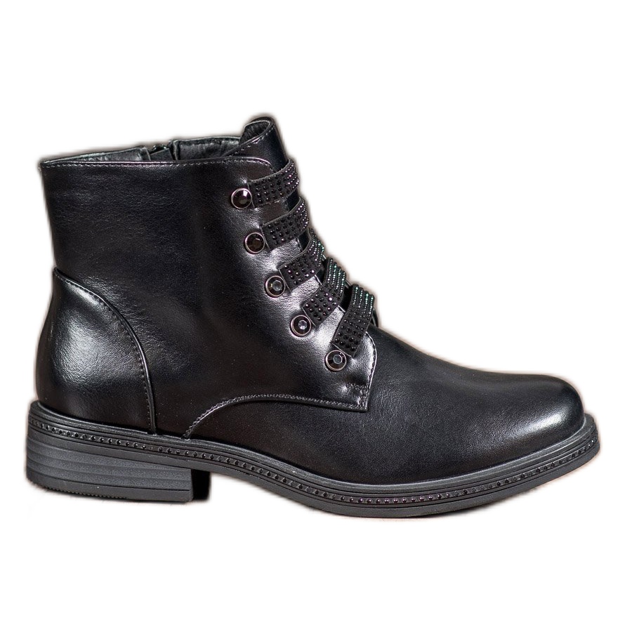 Fabriqué en cuir écologique de haute qualité dans une élégante couleur noire, Workers s'accorde parfaitement avec une variété de tenues, des plus décontractées aux plus élégantes. Le laçage haut et la fermeture supplémentaire assurent la stabilité, tandis que le contrefort de talon souple augmente le confort de port. Le design minimaliste avec un bout rond, souligné de subtils cristaux et strass, leur confère un caractère unique.