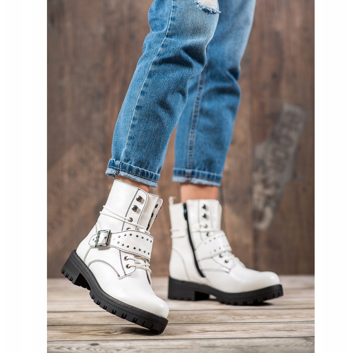 Fabriqués en cuir écologique de haute qualité, ils assurent durabilité et confort. La boucle décorative et les strass leur donnent du caractère et soulignent leur style unique. La semelle noire et épaisse contraste parfaitement avec la couleur blanche de la tige, créant un ensemble harmonieux.