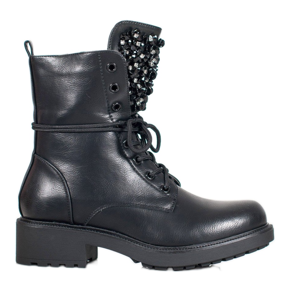 Toute la tige des chaussures est dans une teinte noire élégante qui s'adapte parfaitement à de nombreux styles. La languette des chaussures est décorée de cristaux noirs finement disposés, qui leur confèrent un éclat et un caractère uniques. En plus de leur aspect attrayant, les Workers sont équipées de solutions pratiques : des lacets qui assurent un ajustement parfait au pied et une fermeture éclair qui facilite leur enfilage.