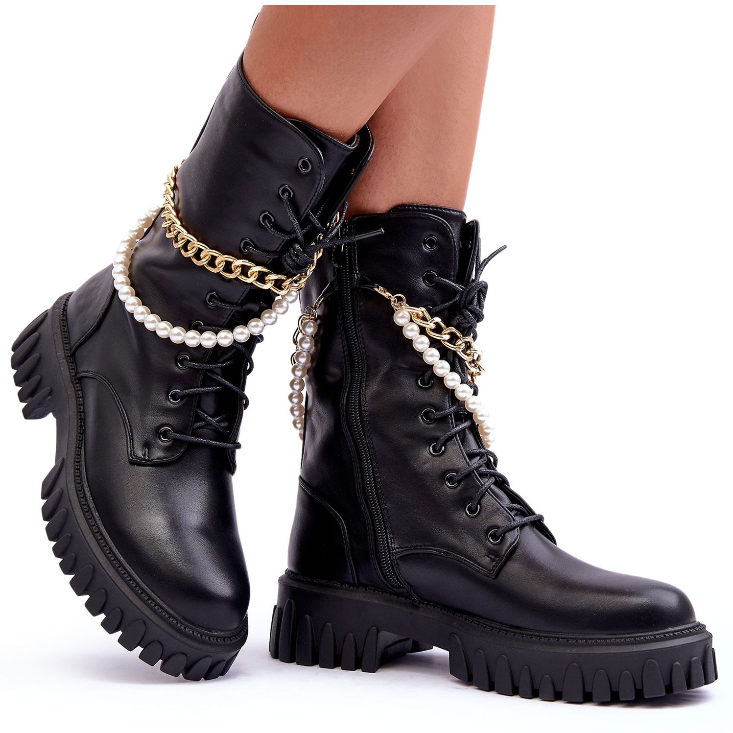Ce modèle se distingue par une fermeture éclair pratique et un laçage supplémentaire, qui permettent d'ajuster parfaitement la tige à la largeur de la jambe. Le talon renforcé assure stabilité et confort de port. Un avantage supplémentaire réside dans les chaînes élégantes et les perles artificielles qui confèrent aux chaussures un caractère unique : elles peuvent être facilement détachées, ce qui permet une personnalisation.